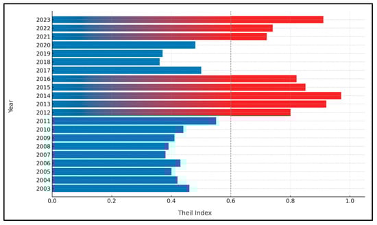 Following the analytical framework described in Section 2.4, the Global Theil Index was computed annually for the 2003–2023 period as (Equation (1)):