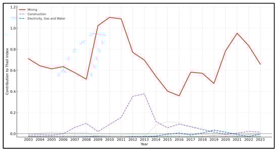 Sectoral Dynamics of Structural Concentration in Atacama (2003–2023): Mining as the Critical Driver of the Theil Index. Mining’s disproportionate contribution (above 1.0 during copper booms) underscores the enclave nature of Atacama’s economy, while the stabilizing role of non-extractive sectors reveals untapped potential for diversification. Source: Authors’ elaboration based on data from the Central Bank of Chile. Calculations performed in Python using harmonized GDP series (2018 base).