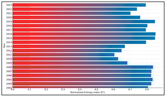 As defined in Section 2.4, the Normalized Entropy Index was calculated annually for 2003–2023 using the following expression (Equation (3)):