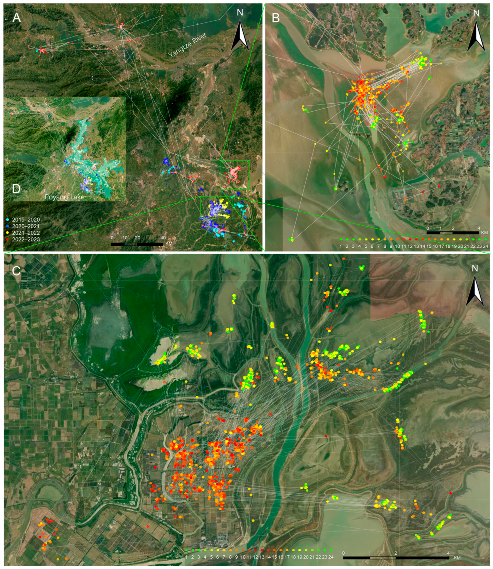 - Li, Y.; Dong, X.; Hu, C. The impact of ecological water level on wintering migratory birds in Poyang Lake—Focusing on phytophagous geese. Ecol. Indic. 2024, 169, 112946. [Google Scholar] [CrossRef]