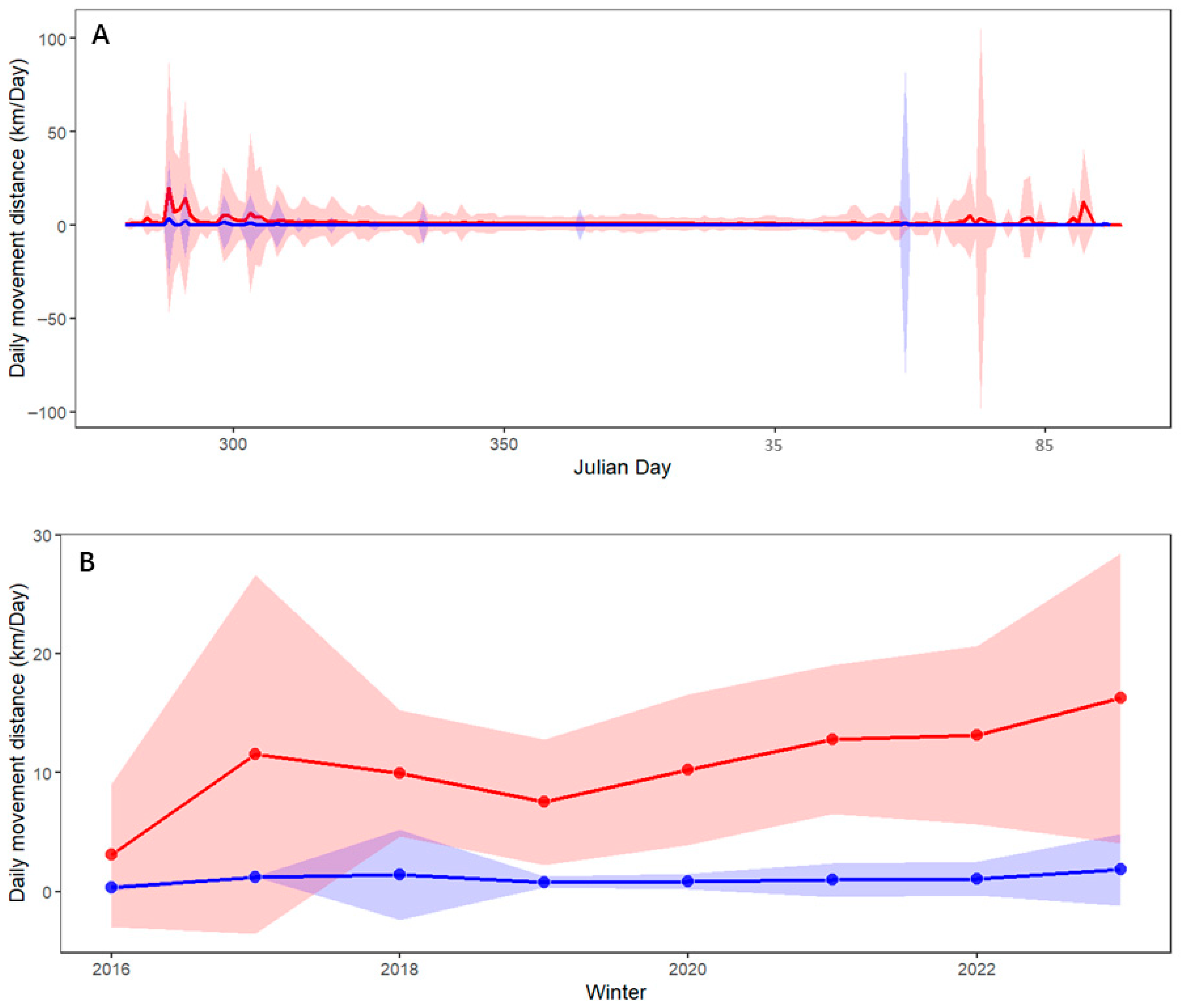 | Winters | Mean Daily Movement Distance (km) | No. of Cranes | Difference Comparing with 2022–2023 | Std. Error of the Difference | t Value | p Value |