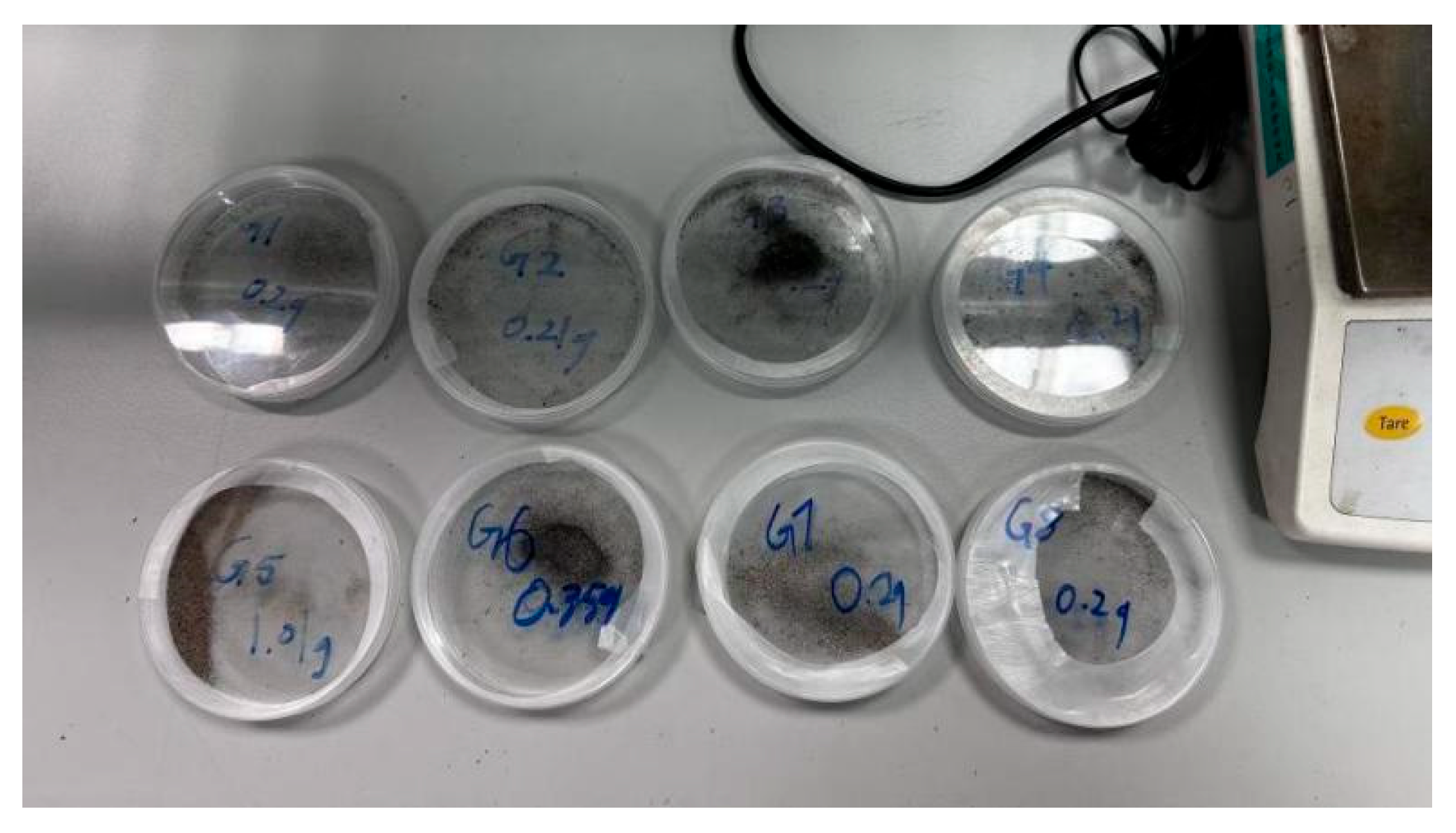 | Sampling Weight (g) | Motorcycle | Private Car | Taxi | Bus | Truck | Total Number of Vehicles | Pavement Material | Temperature (°C) | Relative Humidity (%) | |