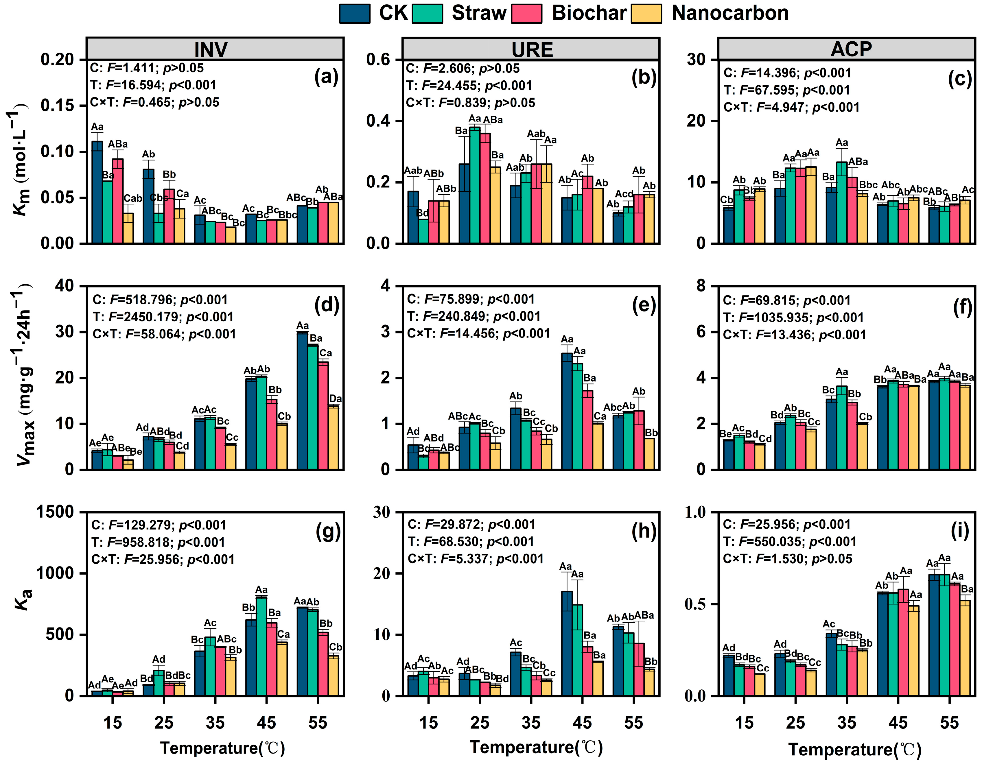 Figure 2. Enzyme kinetic parameters of (a,d,g) invertase (INV), (b,e,h) urease (URE), and (c,f,i) acid phosphatase (ACP) after three carbon sources addition at 15–55 °C. The results of the two-way ANOVA are attached at the top of the figures. C, the main effects of carbon source; T, the main effects of temperature; C × T, the interaction effects of carbon source and temperature. Different uppercase letters indicate significant differences between treatments with different carbon sources at the same temperature, and different lowercase letters indicate significant differences between temperature at the same treatment (p < 0.05). Values are mean ± standard deviation (n = 3).