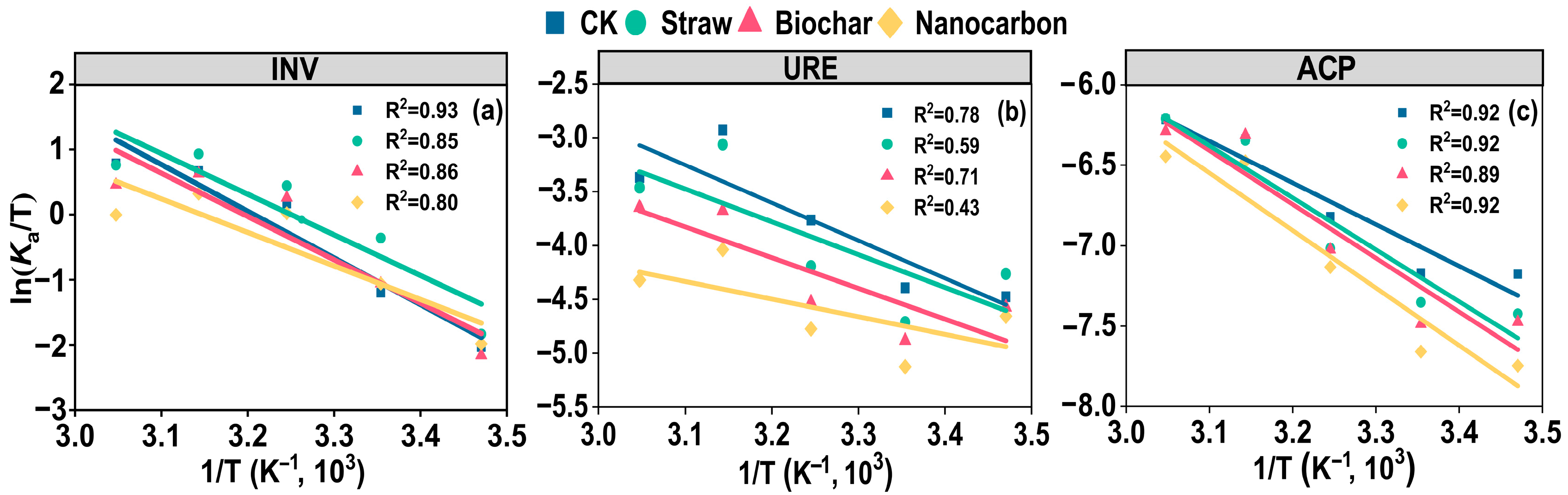 Figure 3. Eyring plots for (a) invertase (INV), (b) urease (URE), and (c) acid phosphatase (ACP) activities after three carbon sources addition at 15–55 °C. The horizontal axis represents 1/T, the vertical axis represents ln(Ka/T), R2 represents the degree of fit of the linear equation. T: temperature; Ka: catalytic efficiency.