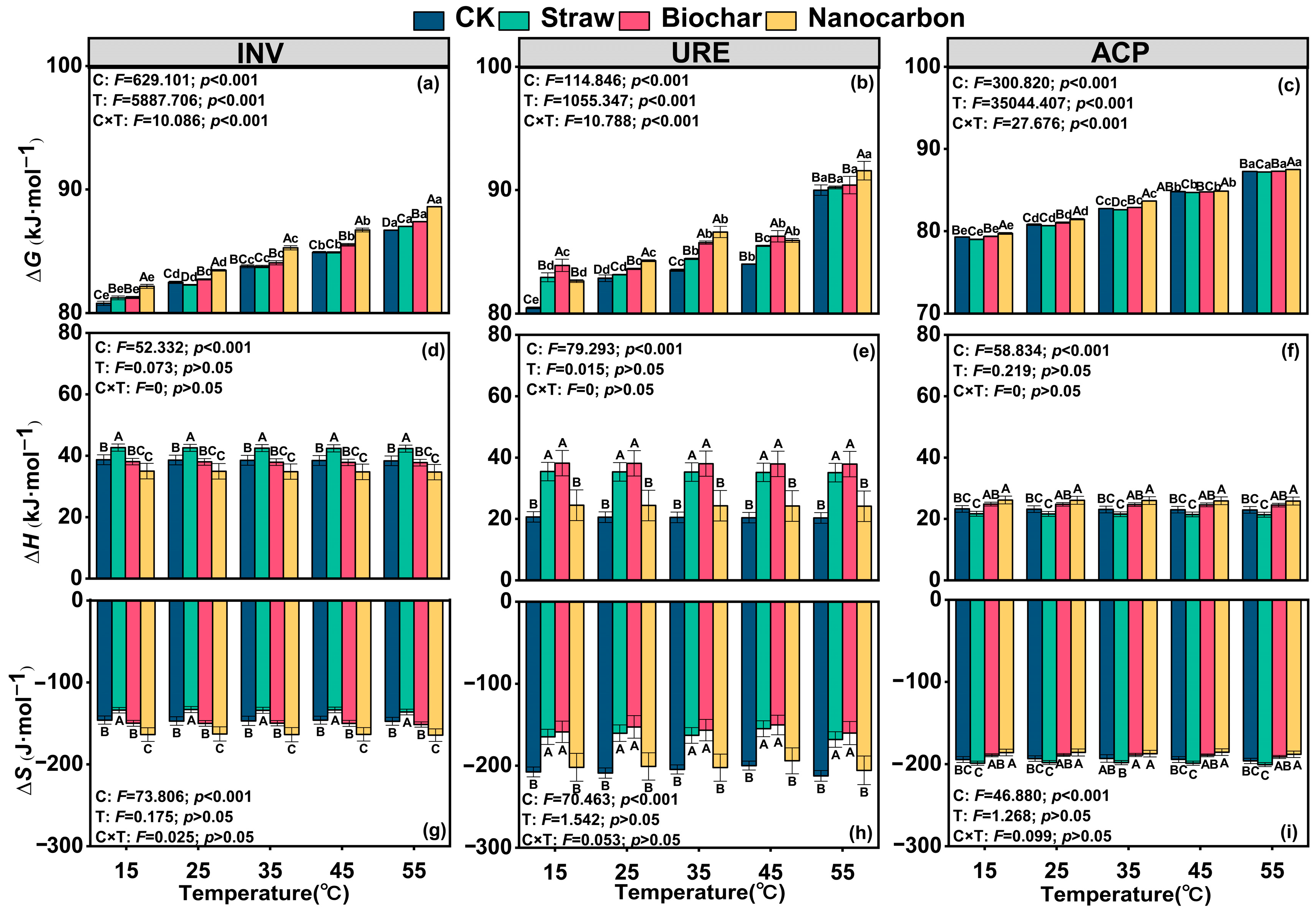 Figure 4. Enzyme thermodynamic parameters of (a,d,g) invertase (INV), (b,e,h) urease (URE), and (c,f,i) acid phosphatase (ACP) after three carbon sources addition at 15–55 °C. The results of the two-way ANOVA are attached at the top of the figures. C, the main effects of carbon source; T, the main effects of temperature; C × T, the interaction effects of carbon source and temperature. Different uppercase letters indicate significant differences between treatments with different carbon sources at the same temperature, and different lowercase letters indicate significant differences between temperature at the same treatment (p < 0.05). Values are mean ± standard deviation (n = 3).