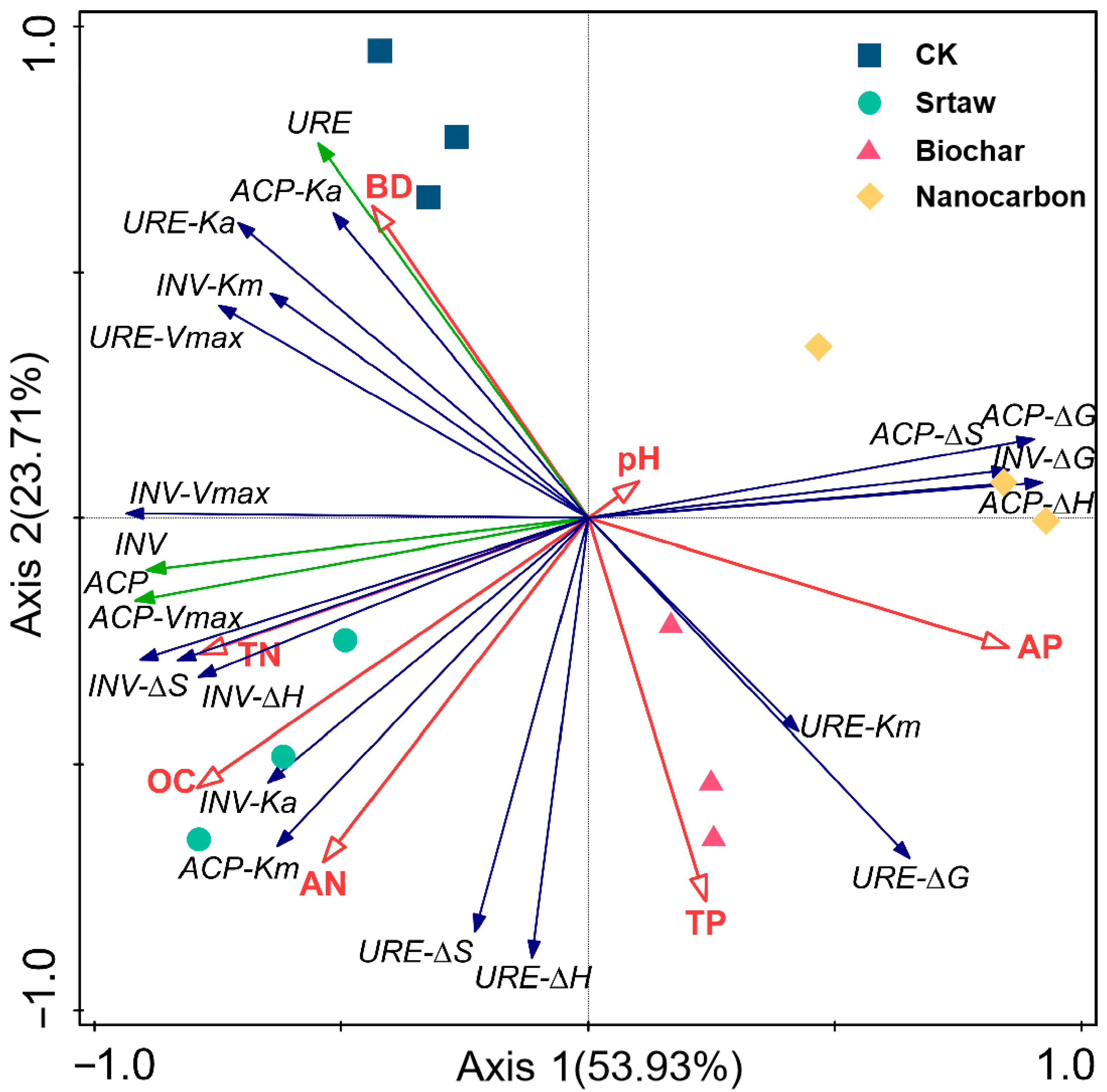 Figure 6. Redundancy analysis of hydrolase catalytic characteristics and physical chemical properties of soil. The geometric figure represents the different carbon source treatments. Red lines represent soil physicochemical properties, green lines represent soil hydrolase activities, blue lines represent kinetic and thermodynamic parameters of soil hydrolases. BD: bulk density; OC: organic carbon; TN: total nitrogen; AN: available nitrogen; TP: total phosphorus; AP: available phosphorus; INV: invertase; URE: urease; ACP: acid phosphatase.