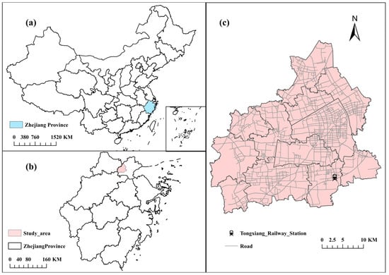 Figure 1. The location of Tongxiang City. (a) The geographical location of Zhejiang Province in China; (b) The geographical location of Tongxiang City in Zhejiang Province; (c) Map of Tongxiang City.