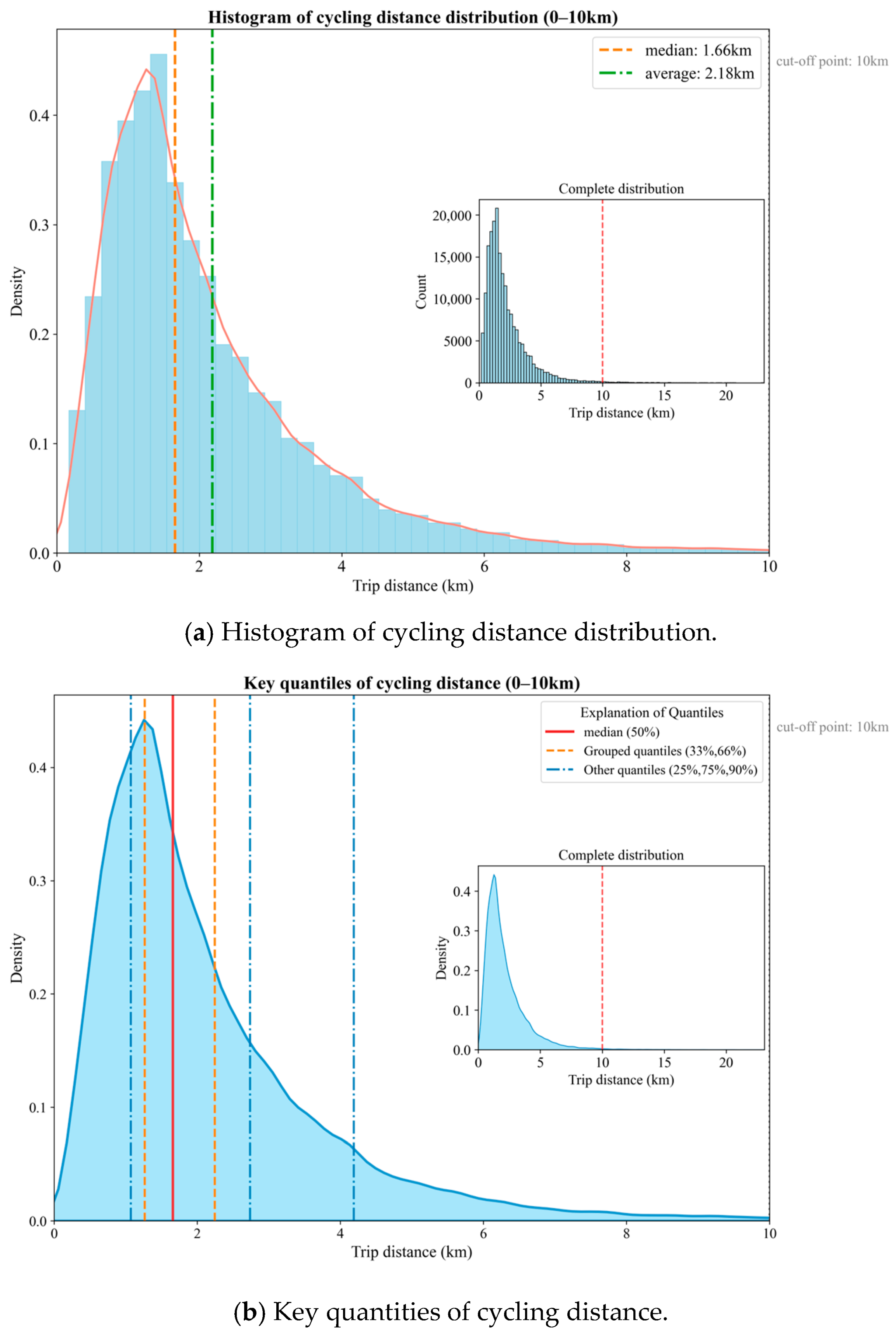 Based on the processed data, a distribution histogram of cycling distances was plotted. Since most cycling distances were below 10 km, the histogram was truncated at 10 km for clearer visualization. Figure 2a shows the frequency distribution of the riding distance of EBS in different intervals. The height of the blue bars represents the relative density of the number of rides within that distance interval. The red solid line covering the histogram is a theoretical distribution curve fitted based on actual data. The blue solid line in Figure 2b is the probability density curve of the riding distance, and the total area enclosed by the curve represents a probability of 1. As shown in Figure 2a,b, the median travel distance is 1.66 km. The 33rd and 25th percentiles are densely distributed to the left of 1.66 km, while the 75th and 90th percentiles are to the right. Since grouping by the median does not require a normal distribution of data, it is more representative of skewed distributions and is not affected by extremely large or small outliers. The median reflects the central tendency of the data. Using the median as a boundary to divide short and long-distance travel can more accurately represent the travel patterns of the majority of users. Dividing short and long-distance travel by the median also helps ensure the number of samples in each group, providing sufficient data support for the study, reducing the impact of randomness, and enhancing the power of statistical tests, making the differences between groups more significant. Additionally, research has shown that for the vast majority of travel purposes, when the travel distance exceeds 1 mile (approximately 1.6 km), the primary alternative modes shift from walking to bicycles, public transportation, or motorized vehicles [24]. Therefore, using 1.66 km as a threshold can effectively distinguish between short-distance travel primarily aimed at replacing walking and medium-to-long-distance travel targeting longer distances. This definition is well-founded in both statistical and behavioral science.