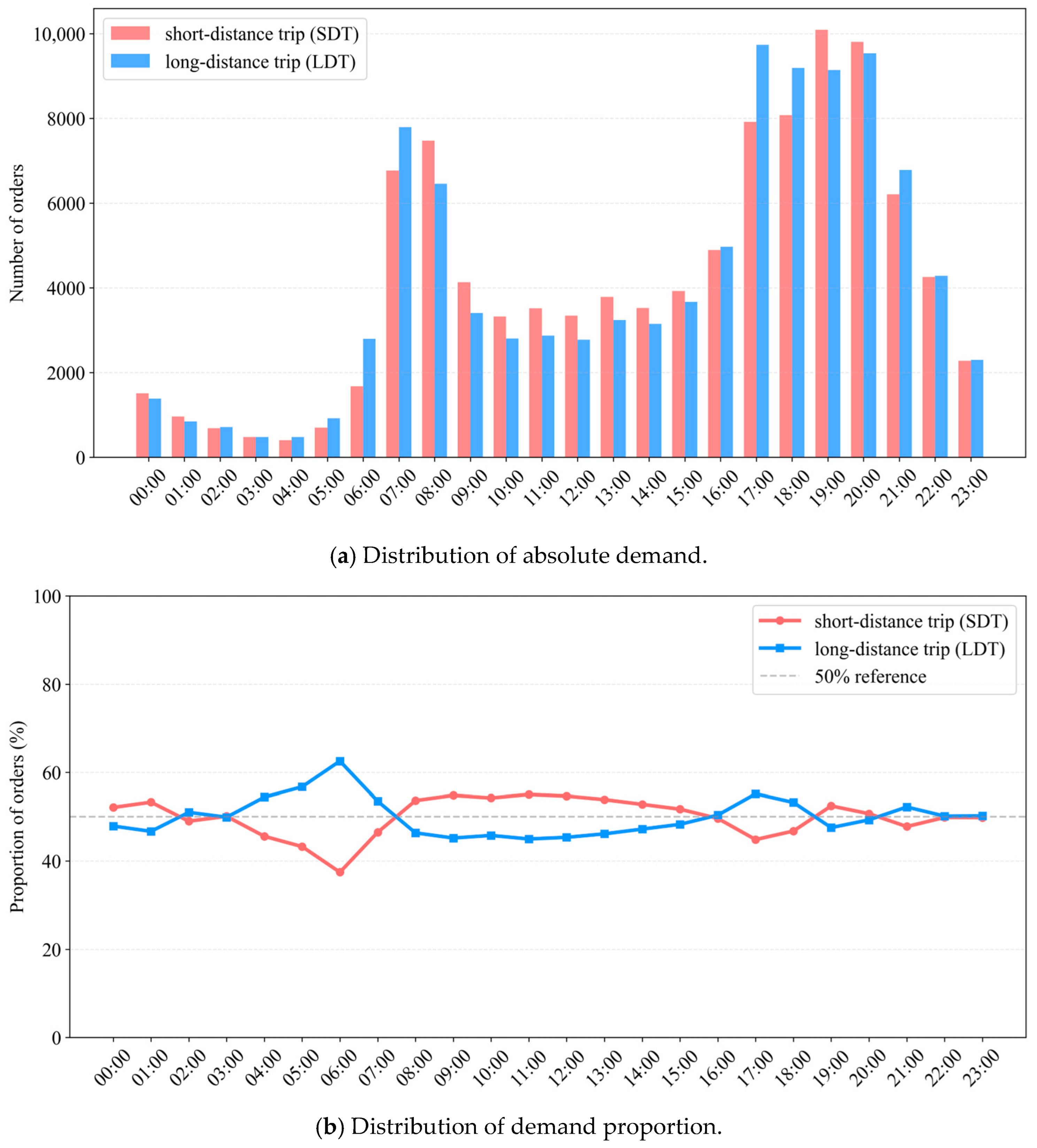 In terms of the temporal distribution of demand (Figure 3a,b), long-distance travel is highly concentrated during the morning and evening rush hours, demonstrating that it is mainly used to meet rigid commuting needs. The proportion of short-distance travel demand during the daytime is relatively stable, indicating that it is mainly used for short-distance connections and non-commuting purposes. The proportion remains high even at night, showing stronger adaptability throughout the day. Therefore, to analyze the differences in demand under different travel distances, this study uses 1.66 km as the median threshold to divide travel into two groups: long-distance and short-distance. This division ensures a balanced sample size while effectively distinguishing between the rigid demand mainly for commuting and the elastic demand mainly for short-distance connections, facilitating subsequent comparative analysis.