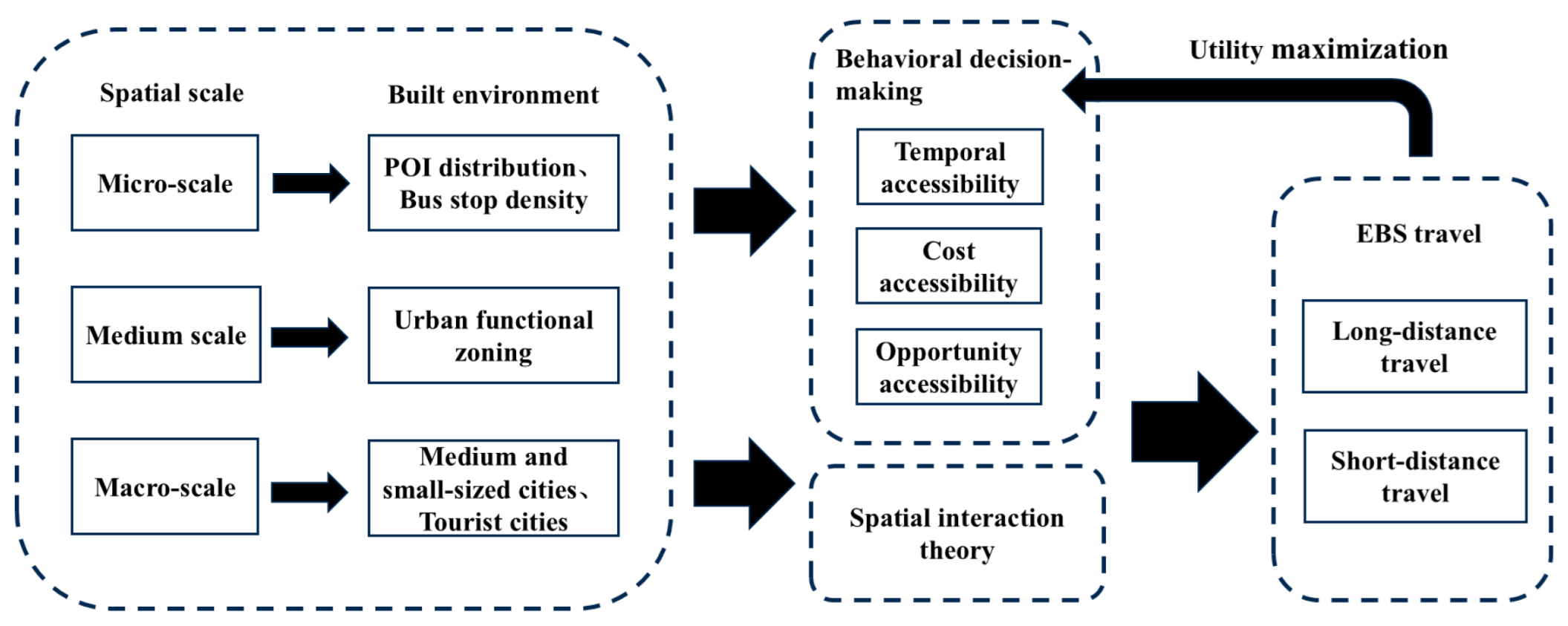 The demand for EBS travel is a rational choice made by travelers based on improved accessibility, under the constraints of urban spatial structure. The impact of different built environment elements (such as urban structure, land use, and POI distribution) exists at different spatial scales, including macro, medium, and micro levels. This theoretically explains the root of spatial heterogeneity. The differentiation of travel behavior between long and short distances is essentially the result of the differential effects of the built environment under different spatial heterogeneity conditions. Based on the above analysis, a theoretical framework has been constructed, as shown in Figure 4.