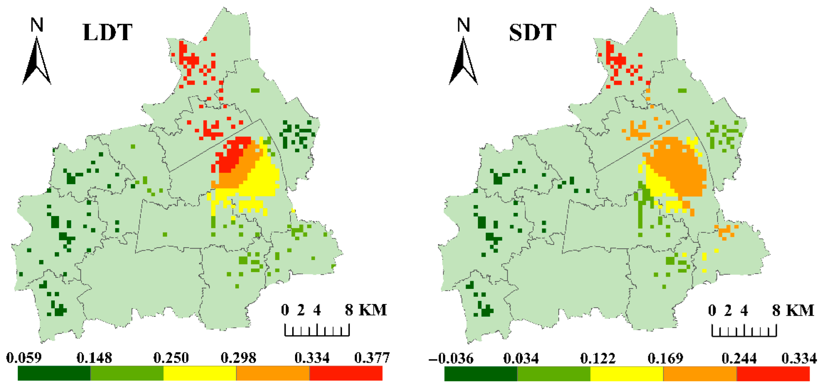EBS’s development modes and demand characteristics in small and medium-sized cities show outstanding differences compared to those in large cities. For example, existing studies have shown that in Qujing city, compared with Kunming city, the travel distance is shorter, and the usage rate of public transportation is lower. Residents in remote areas still rely heavily on private cars to meet long-distance travel needs, while electric bicycles play an important role in both local and regional travel [2]. Unlike large cities, which have well-developed infrastructure, dense road networks, and mature transportation systems, small and medium-sized cities often exhibit a monocentric sprawling pattern. Although the urban areas continue to expand outward, functional zones such as employment, commerce, and residential areas are distributed sparsely, and the demand for medium-to-short-distance travel is prominent. Meanwhile, transportation facilities, public transit accessibility, and income levels are relatively low, making EBS a major choice for short-distance travel [3]. This results in the EBS demand showing a spatial differentiation pattern compared to that in traditional developed cities. Small and medium-sized cities are characterized by small spatial scales, single-center agglomeration, close work–residence relationships, and convenient commuting [4,5]. In contrast, developed cities often have multiple urban centers with high degrees of land use mixing, where a single area can integrate multiple functions such as work, residence, commerce, entertainment, education, and healthcare [6,7]. Moreover, the continuous expansion of small and medium-sized cities has exacerbated the supply and demand imbalance of EBS. From the perspective of travel distance scale, the demand for short-distance ECS trips tends to cluster in the city center and is more likely to replace bicycles and walking. In contrast, the demand for longer-distance trips is scattered in the peripheral areas of the city, leading to a loss of passenger flow from traditional taxis and public transportation. Therefore, the travel characteristics of EBS in small and medium-sized cities and the impact mechanisms of the built environment on their use cannot directly draw on the research conclusions of EBS travel in large cities. However, the vast majority of current studies on the impact of the built environment on the EBS demand focus on large or developed cities. Due to the essential differences in spatial structure, transportation systems, and travel behavior between small and medium-sized cities and large cities, the research conclusions from large cities are difficult to directly apply and promote. More importantly, the impact of the built environment on the EBS demand may exhibit significant spatial heterogeneity. How this heterogeneity is specifically manifested at different travel distances remains a key issue that has not been fully explored in the context of small and medium-sized cities, forming an important research gap.