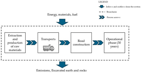 The boundaries of the system determine the input and output flows and, consequently, the impacts considered. It is therefore extremely important to define these boundaries in an LCA study in order to understand exactly what the impact results refer to [33]. The system boundaries considered in this study include the extraction of raw materials as well as the processing and production of materials used for the construction of road embankments, to be referred to within the conversion factors considered (Figure 1). Transport for supply and waste disposal was also considered. Finally, in addition to construction, the operational phase was considered, assuming a useful life of 30 years for the road section.