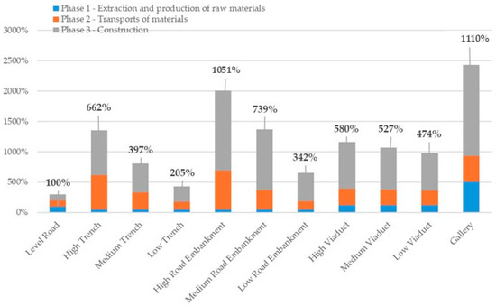 The functional unit is an important choice in an LCA study, as the impacts refer to it. Several studies have considered a specific length of road, usually 1 km as the functional unit [28,29,30,31], while others have considered an area of road, usually 1 m2 [32]. The following study considers 100 m of road section laid as a functional unit. This unit was chosen because tunnels or viaducts are very often less than 1 km long. In such cases, the procedure could not be easily applied to all routes. In any case the results can be considered directly proportional to the chosen length.