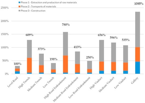 However, including the operational Phase 4, a 537 m at-grade road emits nearly three times (277%) the CO2 of a 100 m tunnel. Therefore, parity of emissions between different lengths is reached only when the at-grade section is approximately 94% the length of the tunnel. This suggests considering that up to that value, the section at ground level could be advantageous from a sustainability point of view, while above that value, the use of a tunnel could be more sustainable.