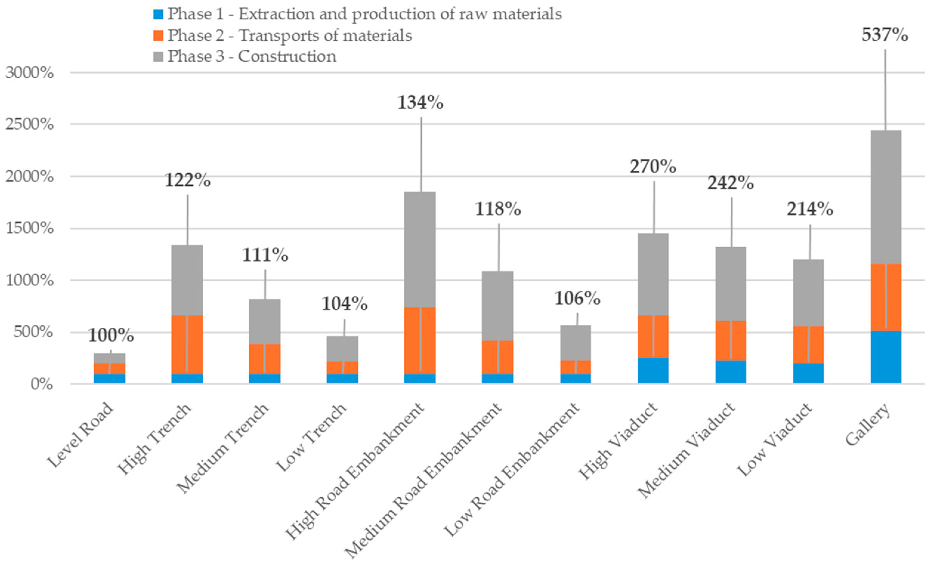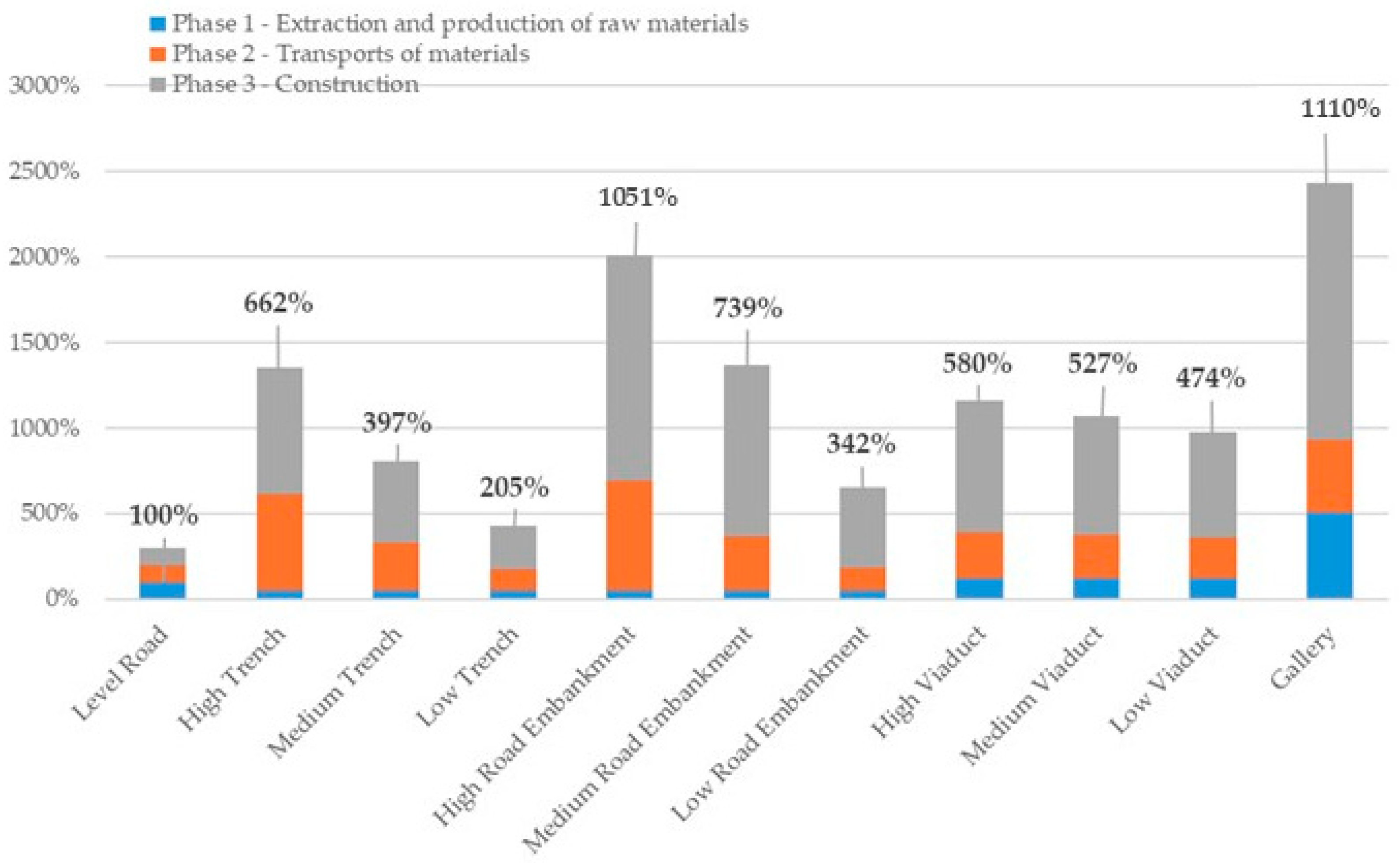 GWP [ton CO2eq—100 years] regarding Phases 1, 2, and 3 normalized to the at-grade road (100%).