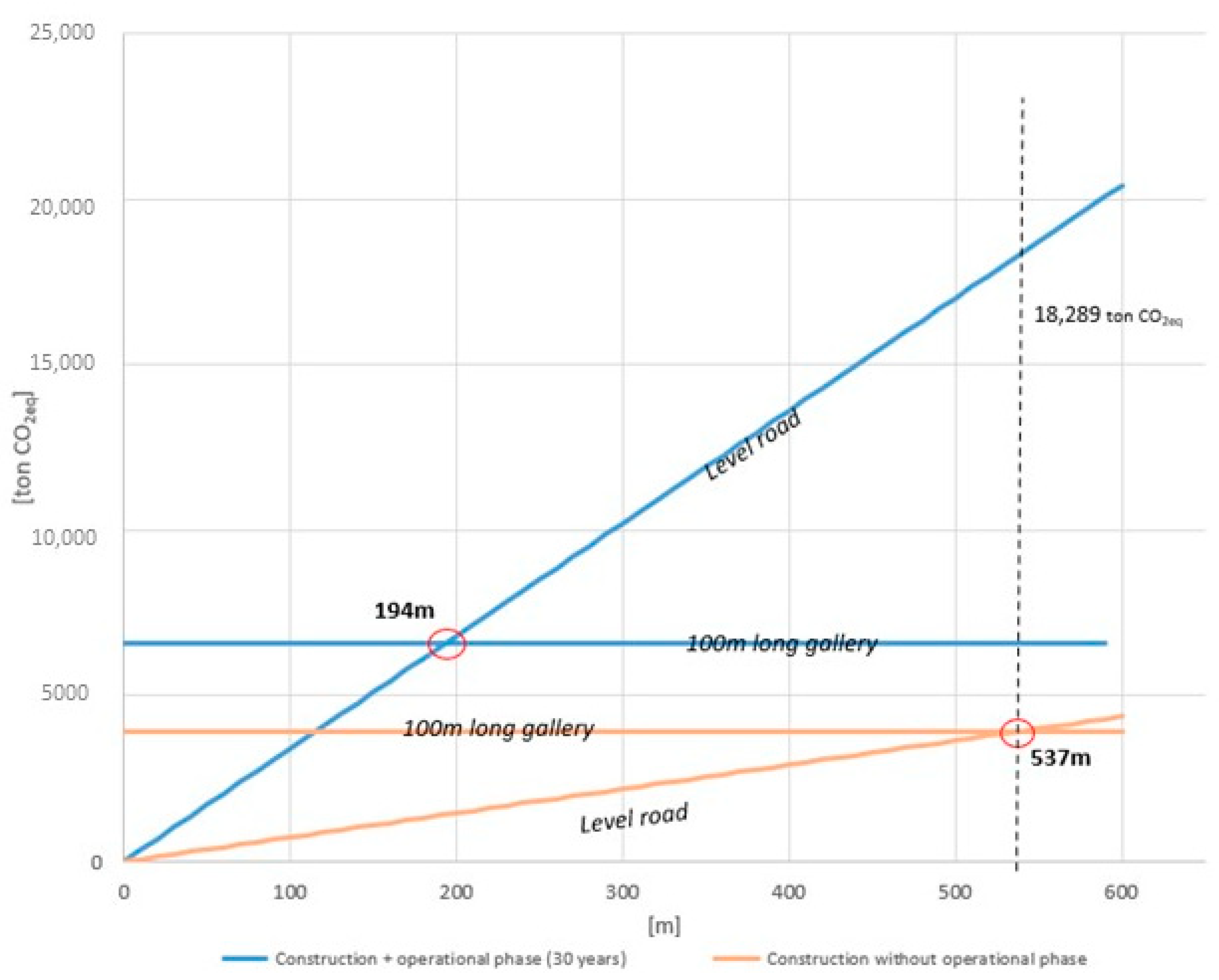 Comparison of tunnel length (100 m) and at-grade road length (537 m) with equivalent GWP of 3914 t CO2eq.