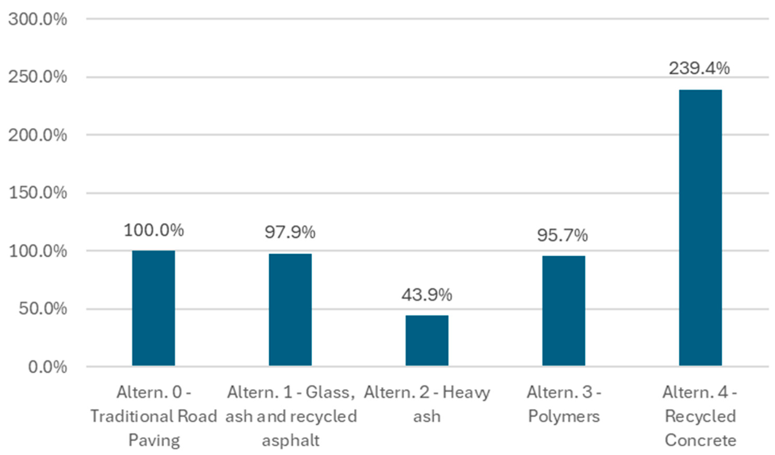 | Recycled concrete | Energy consumption, GWP, and costs are inversely proportional to the recycled asphalt content. Therefore, a significant advantage is obtained with a high recycled asphalt content. | The material combined with asphalt cracks during the winter season. | - |