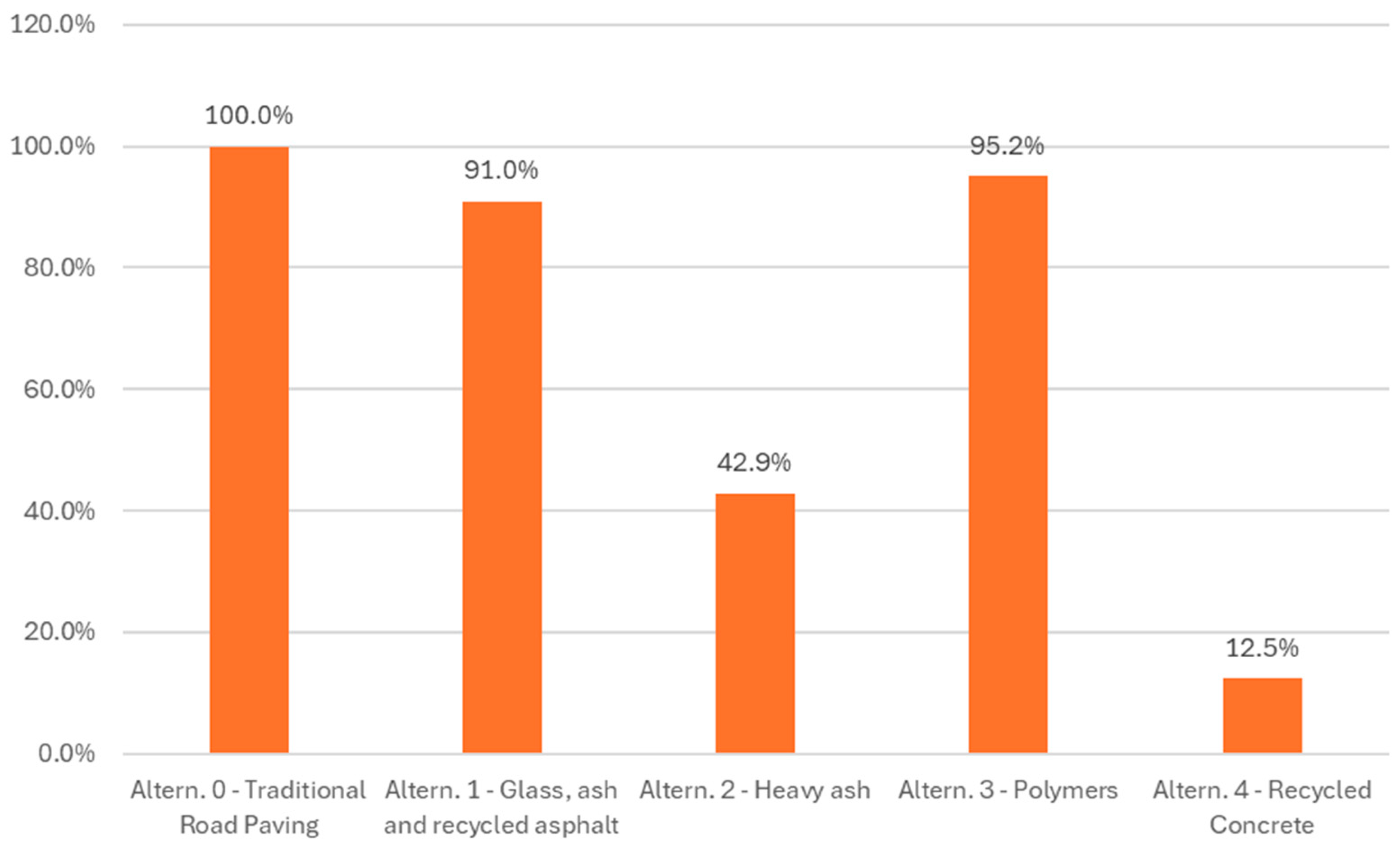 Comparison between % of CO2eq in the four alternatives scenarios and the case study (Alternative 0, equal to 100%).