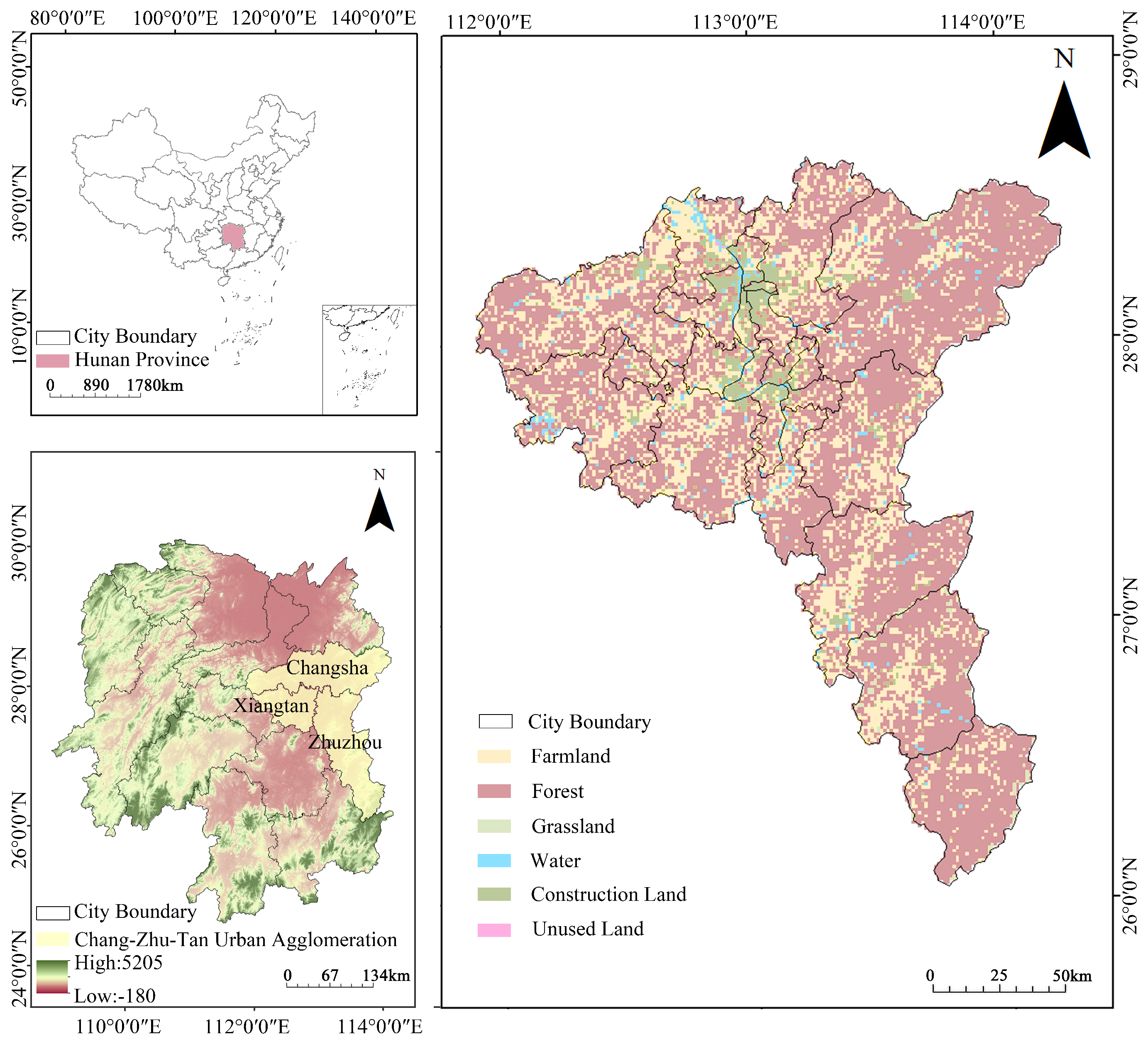 Located in Hunan’s Xiangjiang River Basin, the CZTUA covers the triangular Changsha−Zhuzhou−Xiangtan region (Figure 1). Characterized by basins, hills, and forest-dominated ecosystems, it serves as central China’s key manufacturing, transportation, and service hub. With 2023 comprising 41.5% of Hunan’s total regional GDP, rapid urbanization now poses critical challenges to ecological–urban coordination.