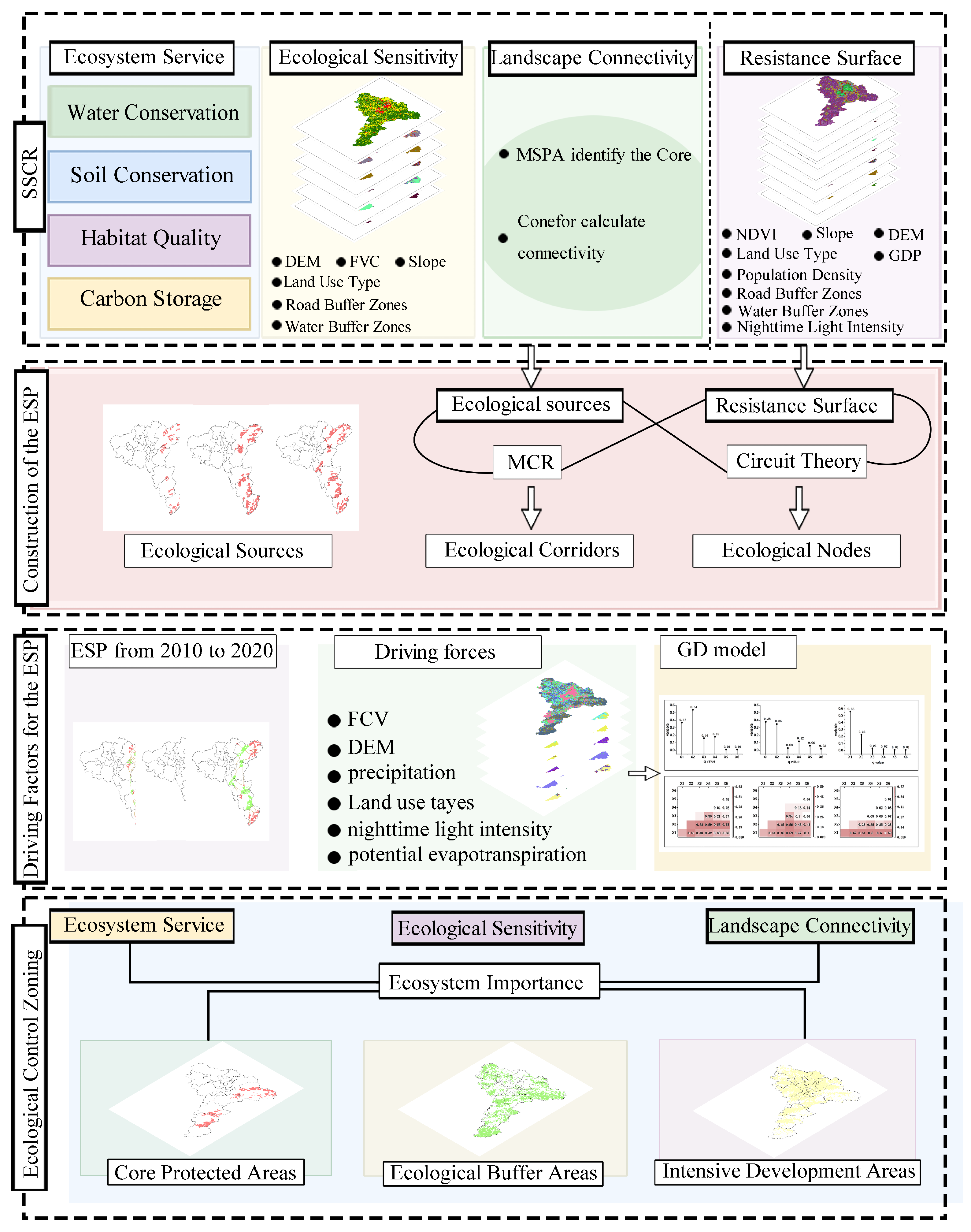 The technical framework of this study is illustrated in Figure 2. First, the SSCR research framework was adopted to construct the ESP of the CZTUA, and the spatio-temporal evolution characteristics as well as the driving forces of the ESP from 2010 to 2020 were explored. On this basis, the ecological control zones of the CZTUA were delineated according to ecosystem importance.