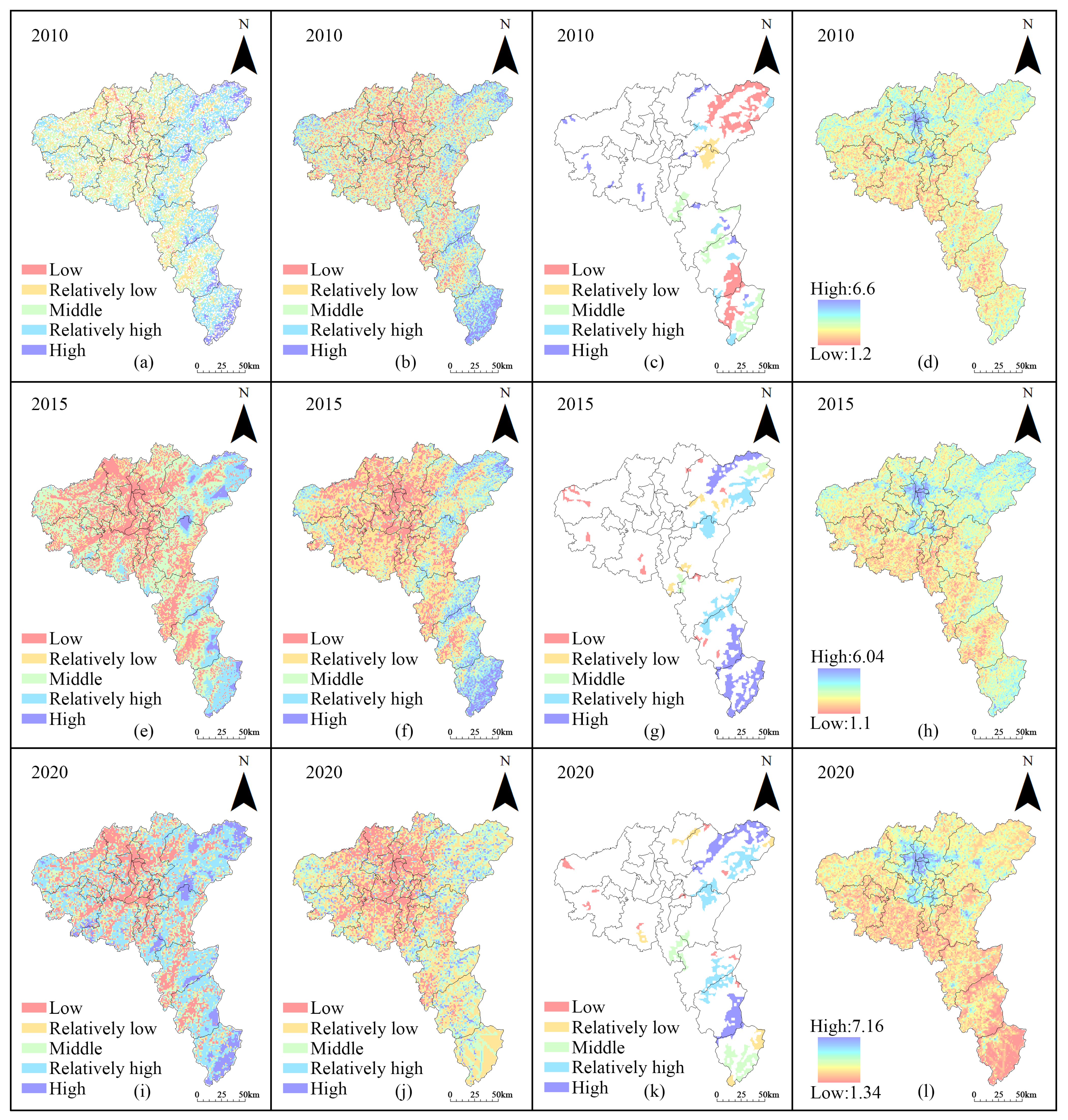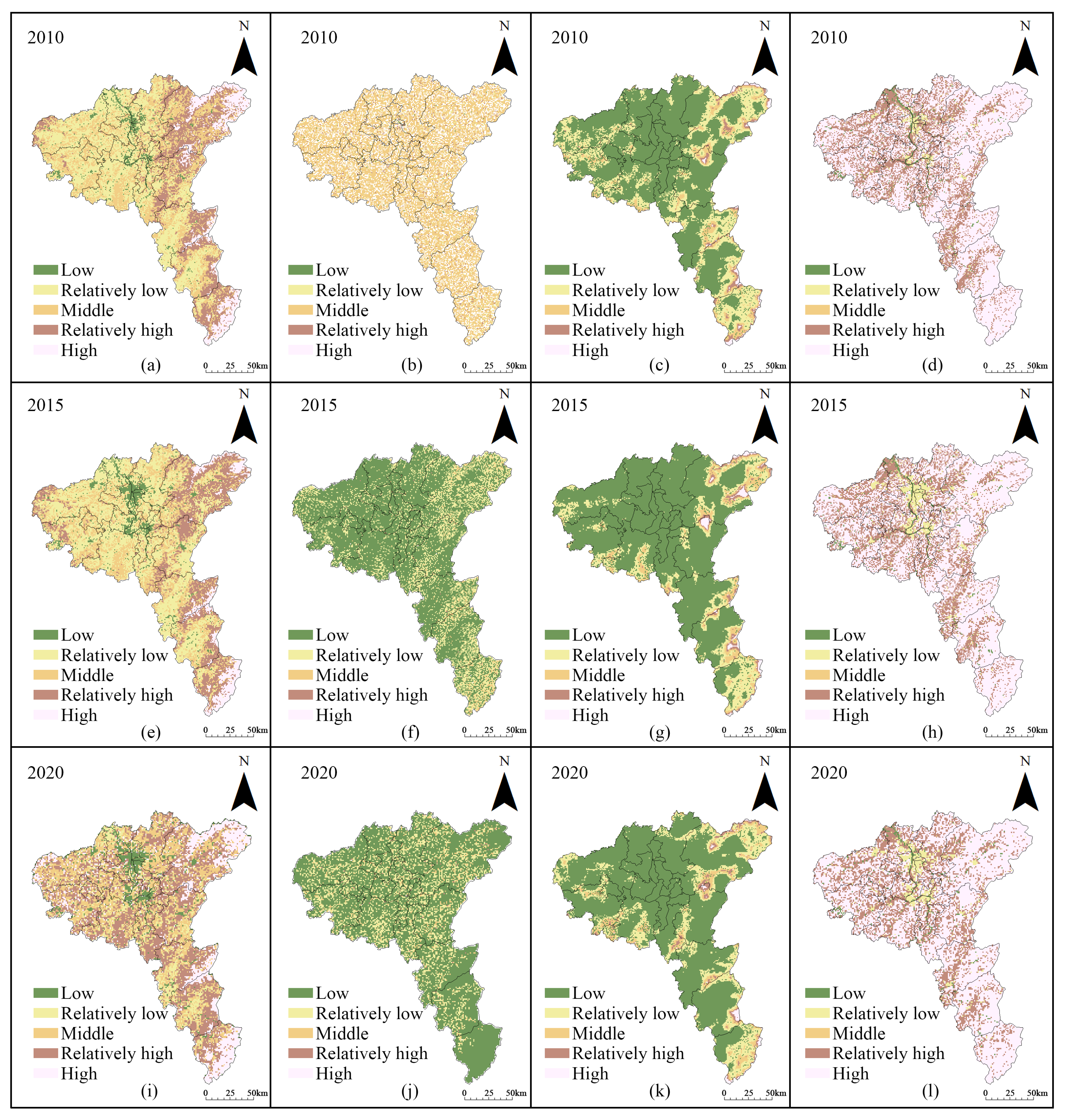 Figure 4. The evaluation of SSCR. (a,e,i) Ecosystem Importance. (b,f,j) Ecological Sensitivity. (c,g,k) Landscape Connectivity. (d,h,l) Resistance Surface.