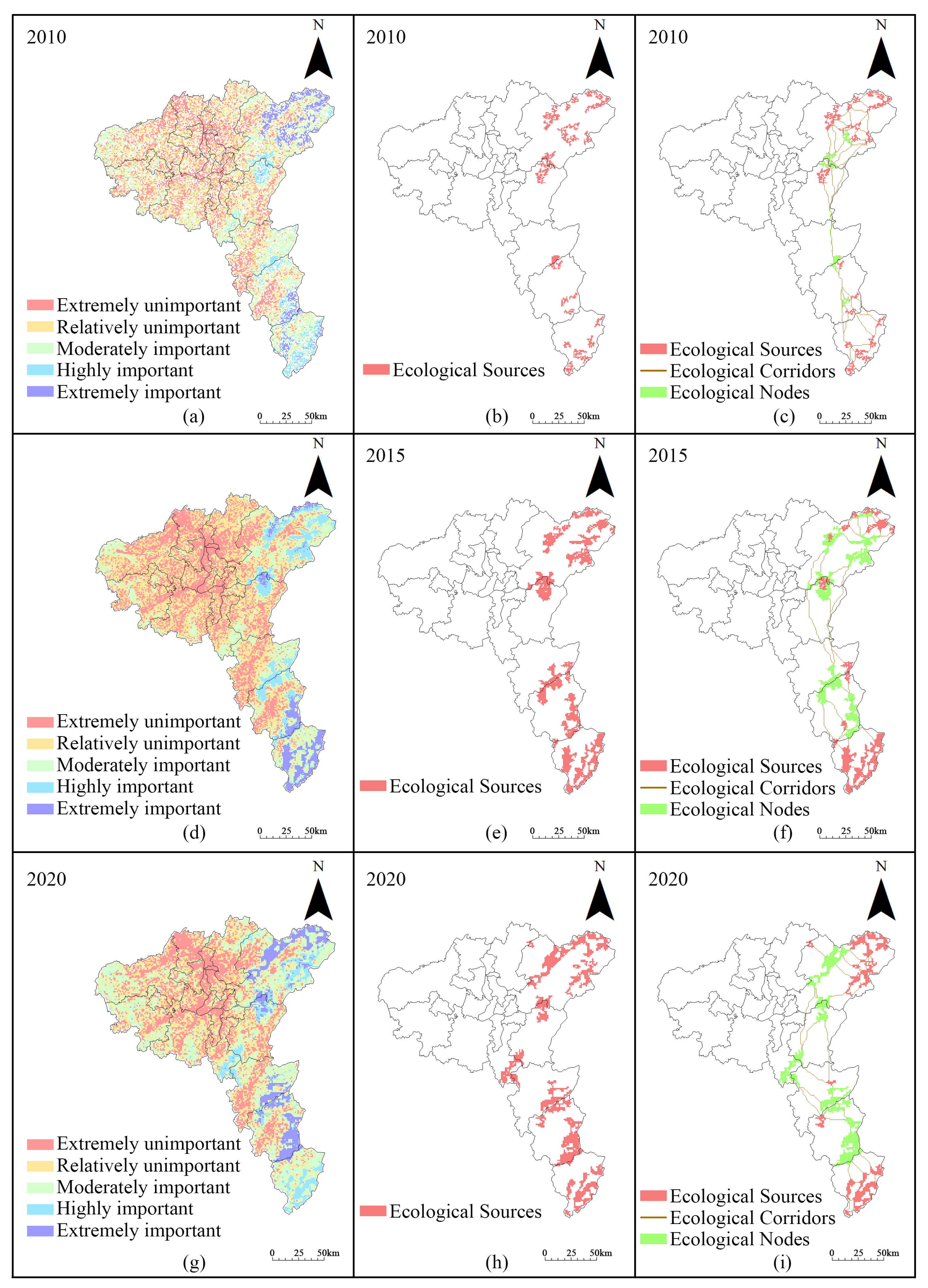 Figure 5. Ecosystem importance, Ecological Sources, and ESP. (a,d,g) Ecosystem Importance. (b,e,h) Ecological Sources. (c,f,i) ESP.