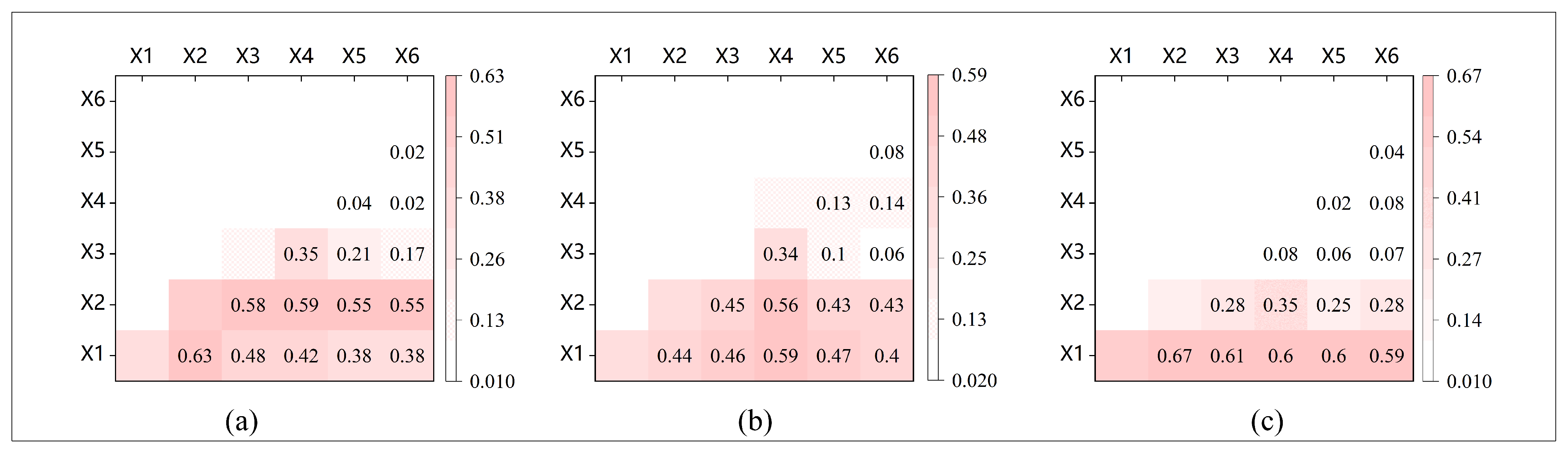 Figure 7. Interaction detector results for the GD model. (a) 2010. (b) 2015. (c) 2020.
