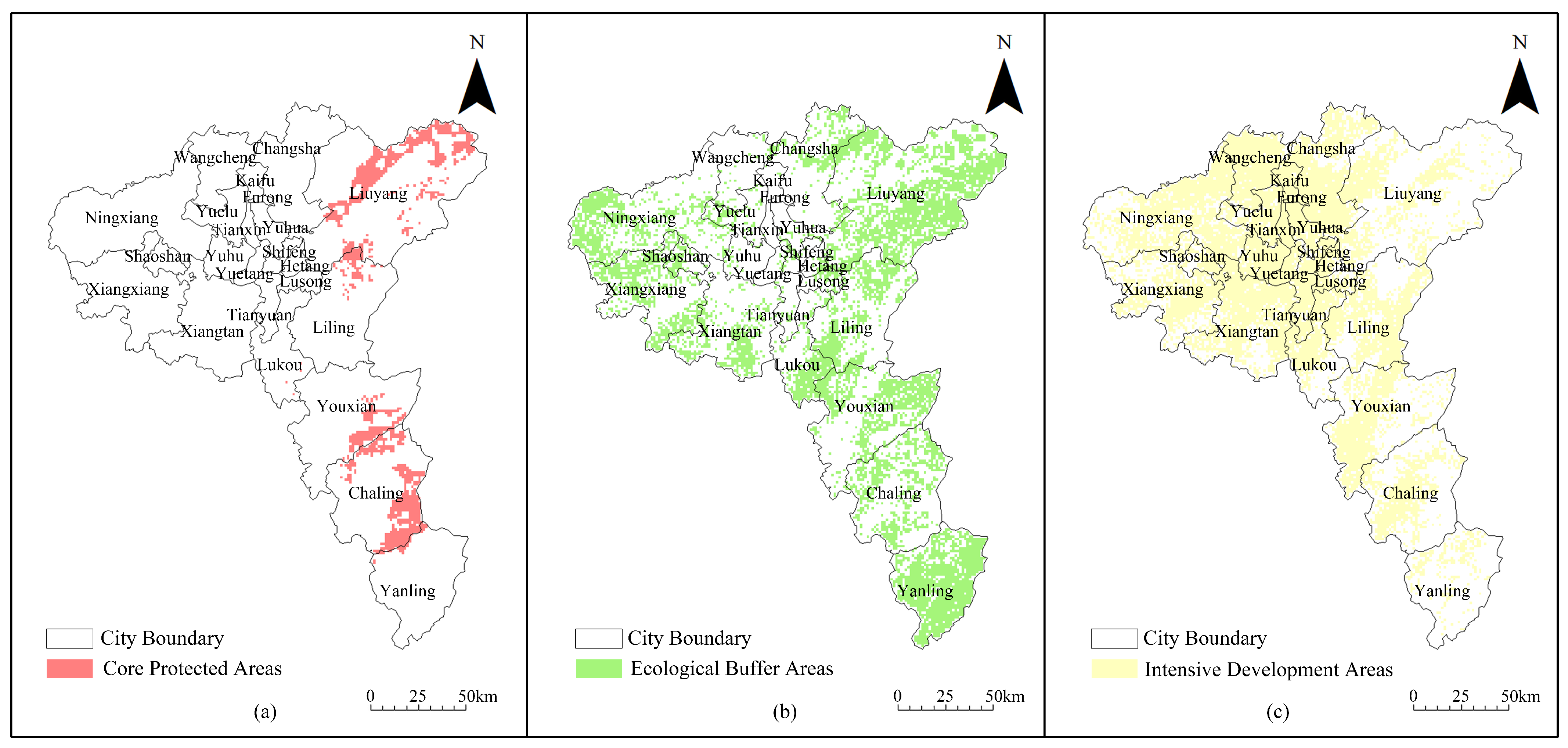 Figure 8. Ecological control zones of CZTUA. (a) Core Protected Areas. (b) Ecological Buffer Areas. (c) Intensive Development Areas.