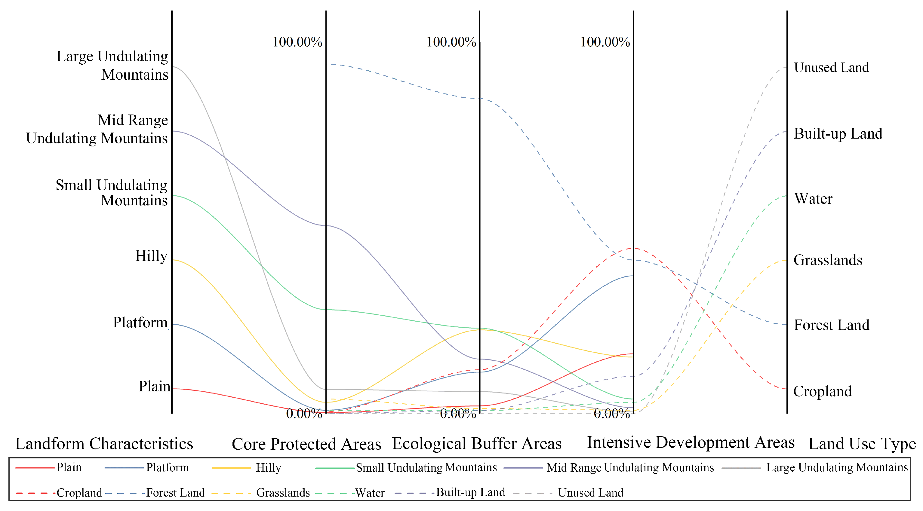 The ecological control zoning results of the study area demonstrate a high degree of synergy with the physical geographical context and land use structure, clearly revealing a spatial gradient pattern of “eastern mountainous ecological core–central hilly ecological buffer–western plateau–plain development zone” (Figure 8). Additionally, Figure 9 illustrates the proportional distribution across different geomorphological types and land use types.