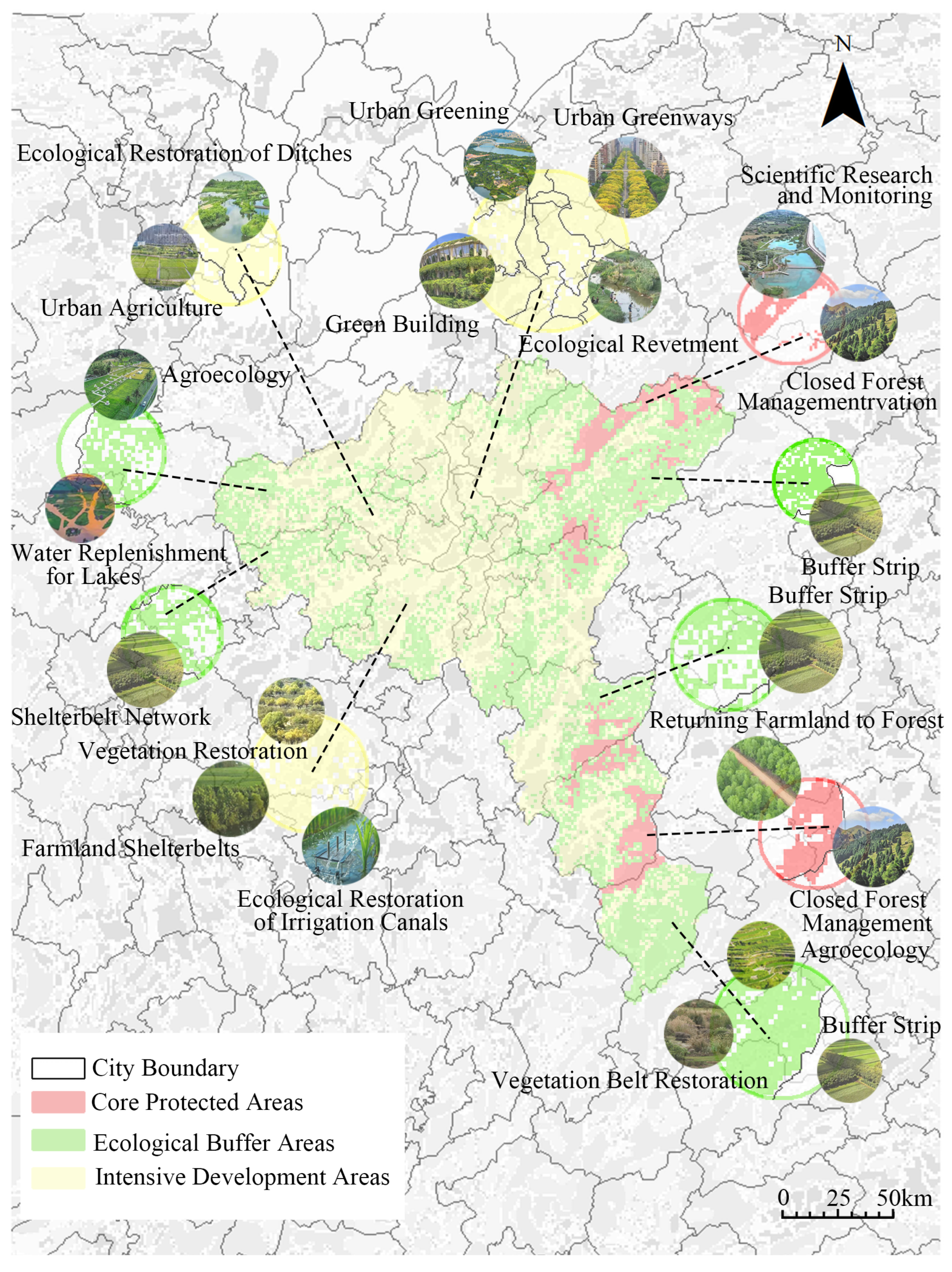 The Intensive Development Zones aim at ecological optimization, primarily covering the main urban areas and key development platforms of Changsha, Zhuzhou, and Xiangtan cities. The core strategy is to implement the construction requirements for a “Beautiful and Clean Metropolitan Area” outlined in the Chang-Zhu-Tan Metropolitan Area Development Plan, deeply integrating ecological concepts into the urbanization and industrialization processes. Strategically, the rigid constraints of urban development boundaries and permanent basic farmland should be strengthened. In core sectors such as the urban stretches along both banks of the Xiangjiang River in Changsha, Tianyuan District in Zhuzhou, and Yuetang District in Xiangtan, stock optimization models focusing on the redevelopment of inefficient industrial land and urban renewal should be vigorously promoted. Drawing on the collaborative governance experience of the Chang-Zhu-Tan Environmental Collaborative Control Plan and the Wuhan Metropolitan Area Ecological Environment Co-protection and Co-governance Three-Year Action Plan, priority should be given to the comprehensive improvement of the water environment and the construction of ecological revetments along the urban sections of the main stream of the Xiangjiang River and the lower reaches of the Liuyang River, ensuring the water ecological security of the “One River and Two Banks”. The ”embedded restoration of ecological functions” should be actively promoted. Within the Intensive Development Areas, and in line with the requirements of the Opinions on Promoting Green Development in Urban and Rural Construction, a systematic effort should be made to construct interconnected urban greenway and blue network systems, embed green isolation belts around industrial parks, and promote green infrastructure technologies such as green roofs, vertical greening, and small wetlands at the community level, establishing community-level ecological nodes. These measures aim to comprehensively enhance the city’s ecosystem service functions like air purification and climate regulation, as well as the quality of the human settlement environment, ultimately achieving the organic unity of high-level protection and high-quality development.