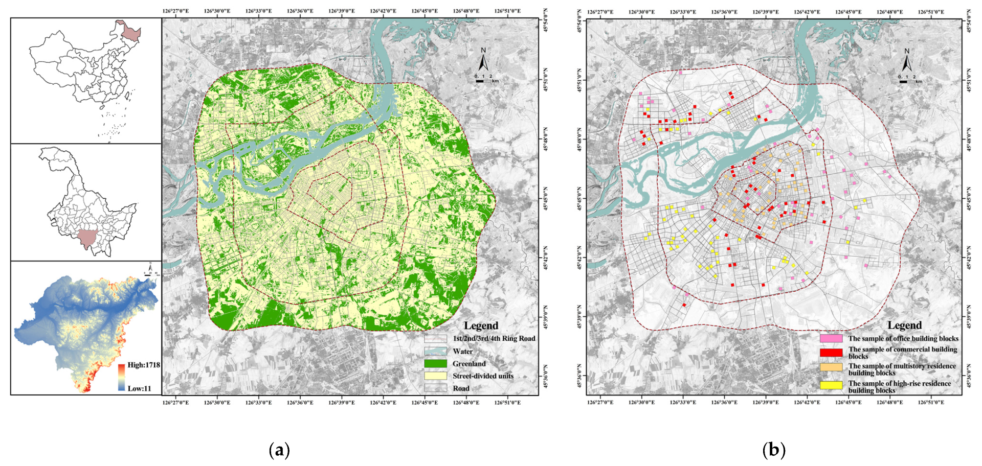 - Wang, J.; Liu, W.; Sha, C.; Zhang, W.; Liu, Z.; Wang, Z.; Wang, R.; Du, X. Evaluation of the impact of urban morphology on commercial building carbon emissions at the block scale—A study of commercial buildings in Beijing. J. Clean. Prod. 2023, 408, 137191. [Google Scholar] [CrossRef]