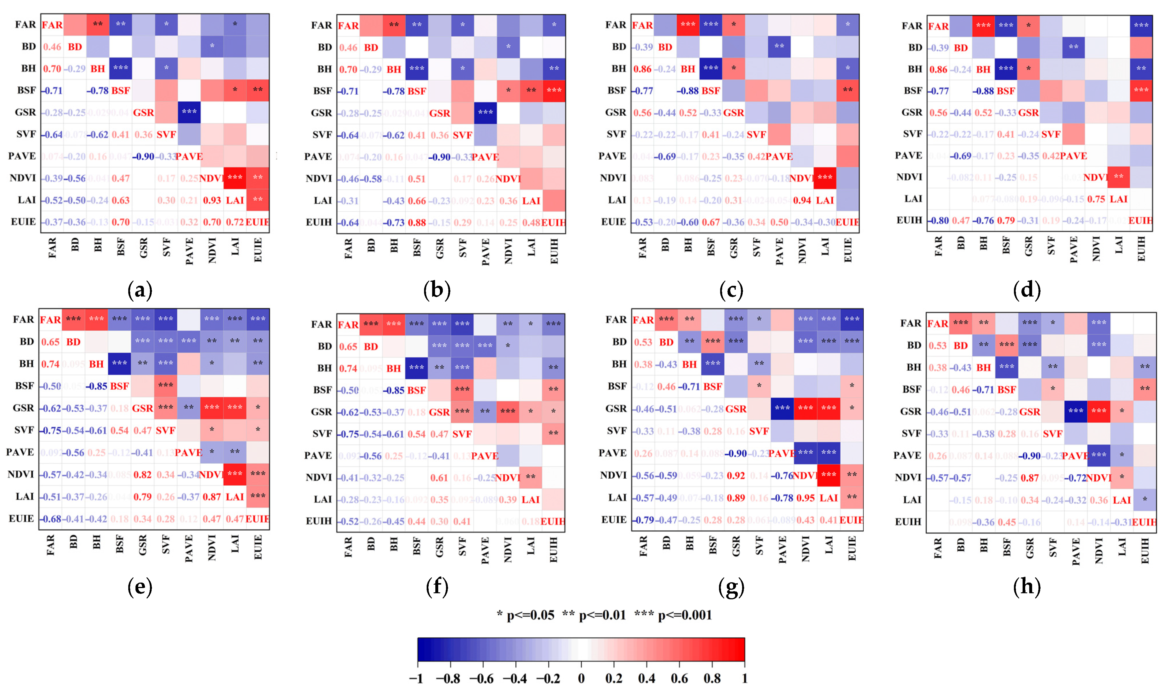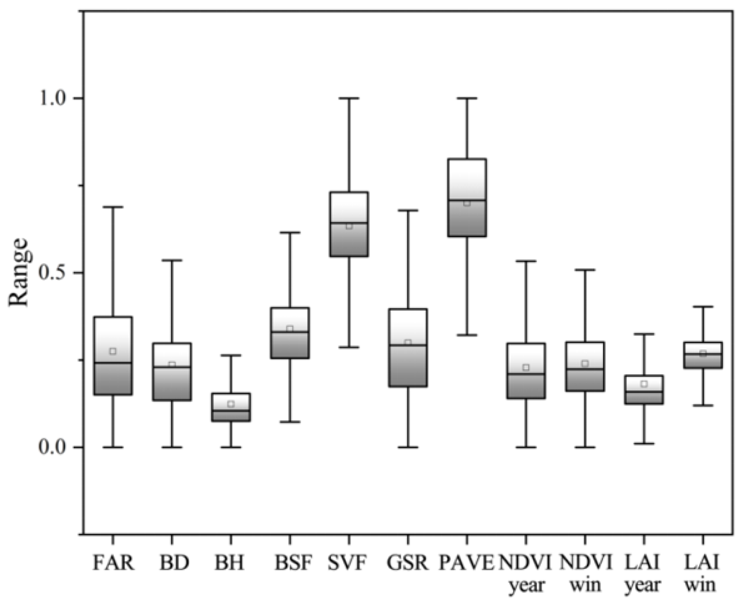 | Building Type | FAR | BD (%) | BH (m) | BSF | SVF | PAVE | GSR | NDVI | LAI |