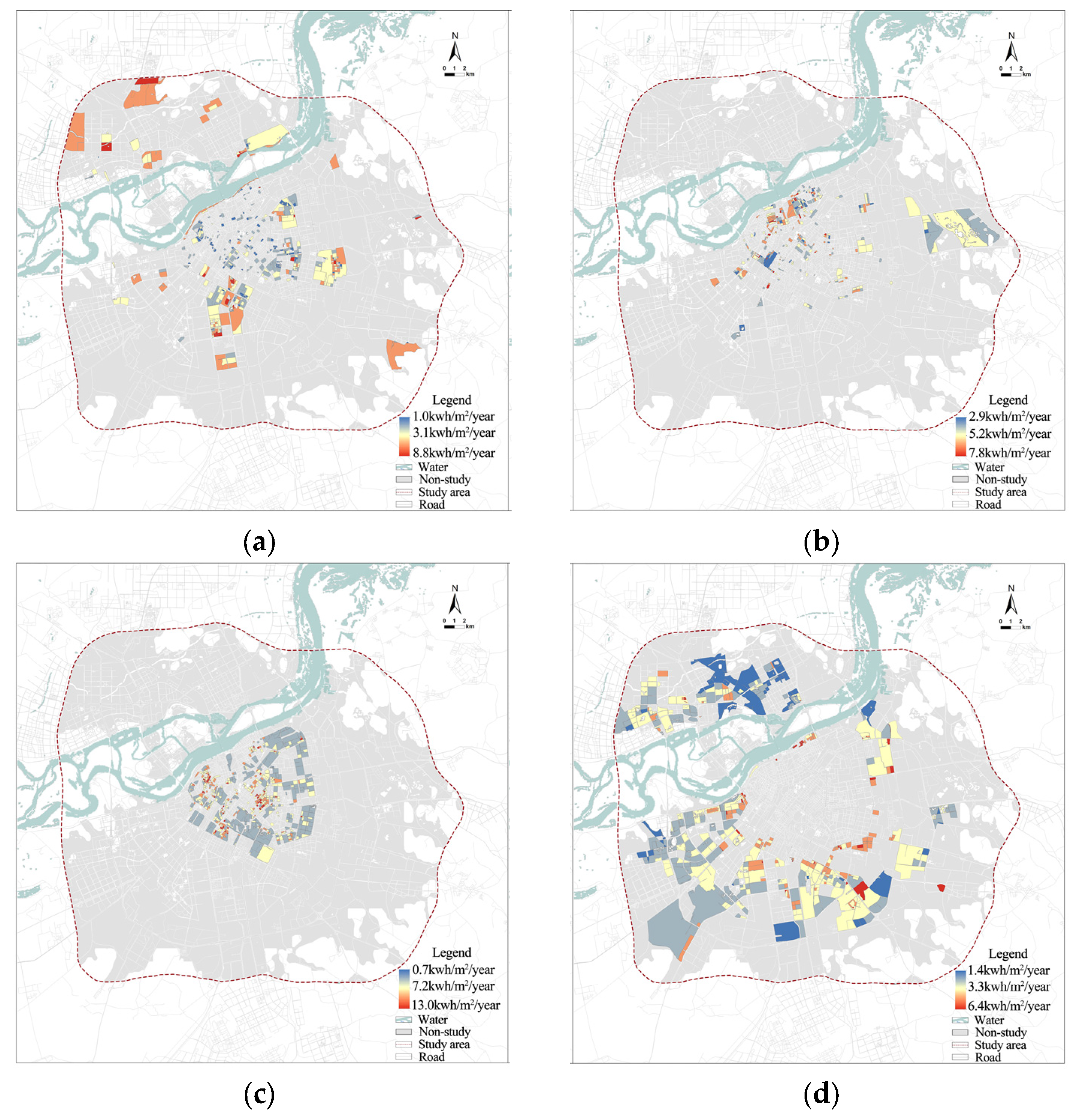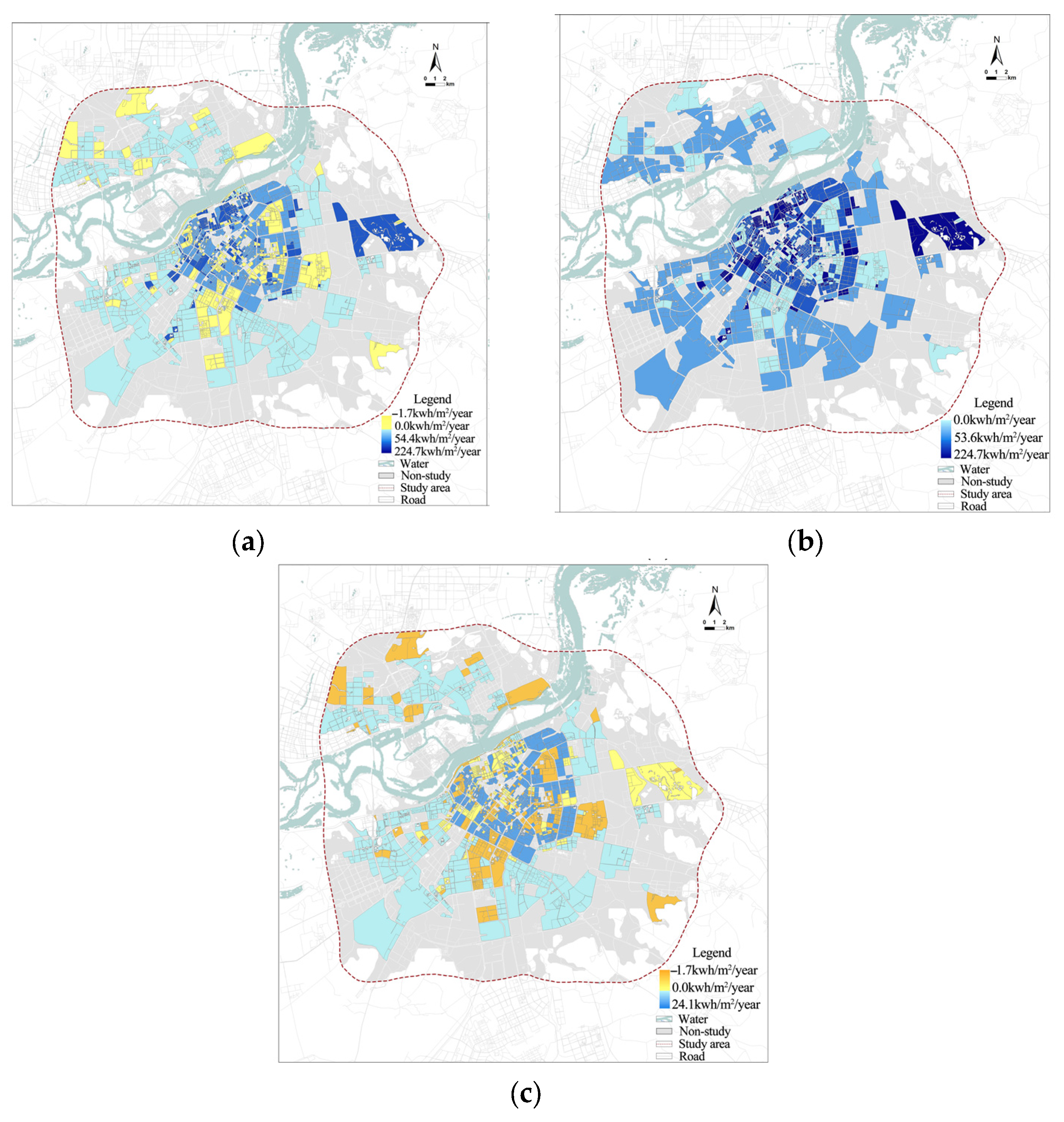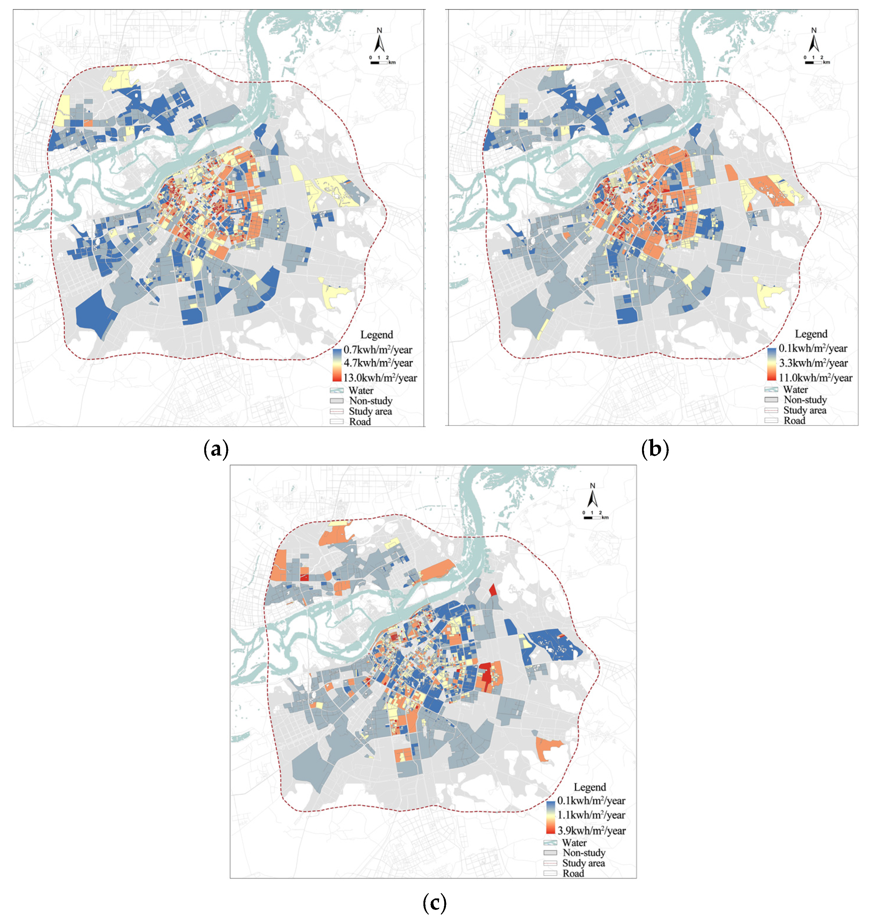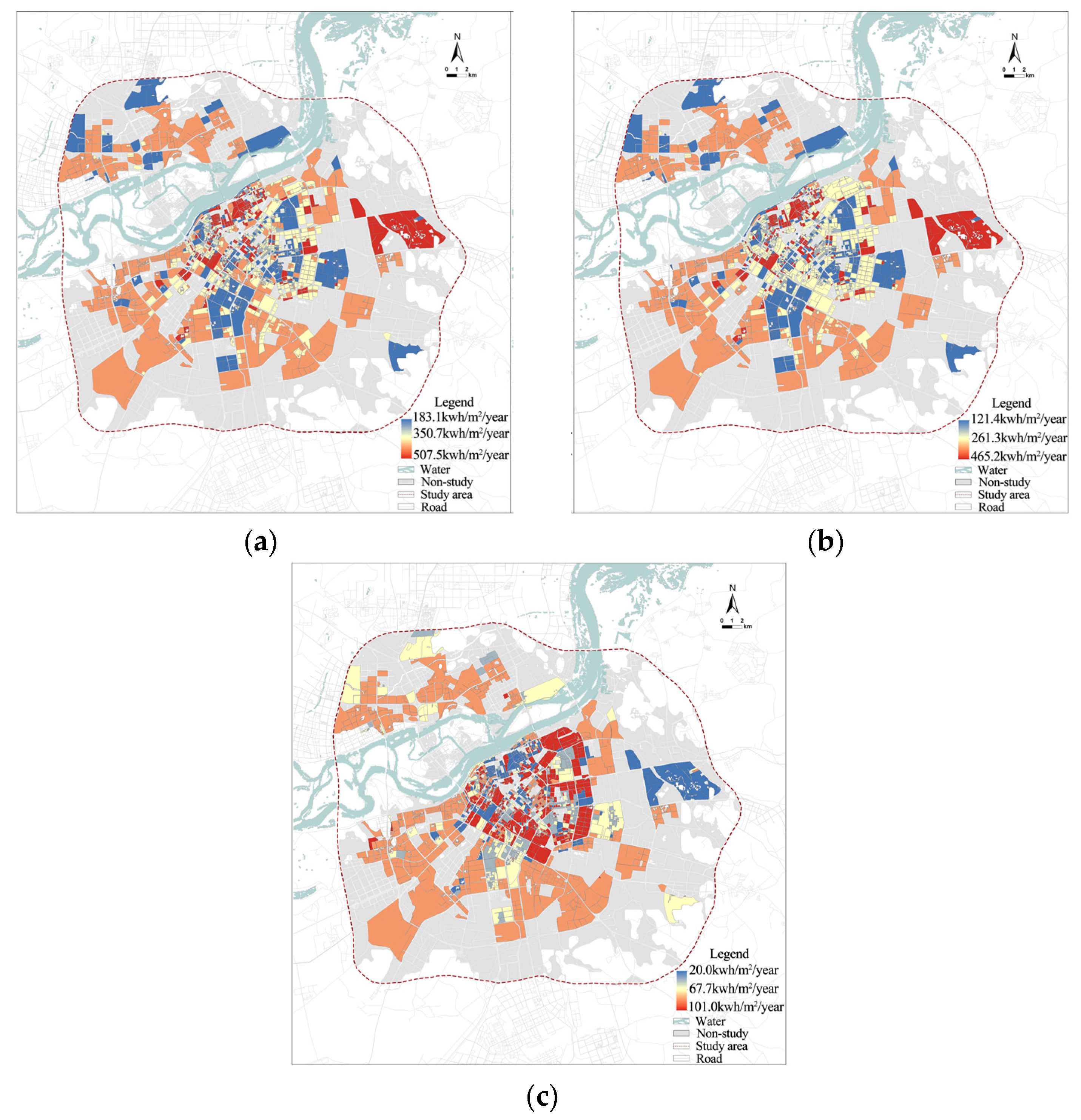 - Liu, K.; Xu, X.; Zhang, R.; Kong, L.; Wang, W.; Deng, W. Impact of urban form on building energy consumption and solar energy potential: A case study of residential blocks in Jianhu, China. Energy Build. 2023, 280, 112727. [Google Scholar] [CrossRef]