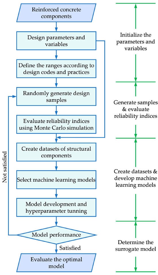 Monte Carlo simulation (MCS) is a widely adopted approach for calculating reliability indices of RC structures []. However, simulation runs on the order of 105 or more are typically required to maintain stable estimations of failure probability, which leads to a significant computational burden. Although several simulation-based alternatives, such as importance sampling, have been developed to improve the efficiency of MCS, computational cost remains a major challenge in the reliability analysis. Additionally, approximate analytical methods, including the first-order second-moment method [], are also popular in calculating engineering reliability. Nevertheless, their accuracy can be difficult to guarantee in highly nonlinear and non-differentiable problems. To balance the incorporation of uncertain factors and the efficiency of optimization design, this study employed a machine learning-based surrogate model to effectively approximate reliability indices of RC structural components. Figure 2 illustrates the framework of the surrogate model.