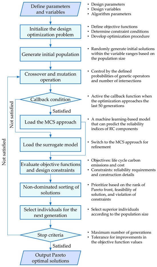 Figure 3 demonstrates the flowchart of the hybrid optimization approach. The bi-objective design optimization of a structural component involves the simultaneous optimization of two objective functions encompassing life cycle carbon emissions and costs defined in Section 2.2 and Section 2.3, while satisfying the reliability constraints and construction requirements as described in Section 2.4. Different optimization objectives typically have a conflicting relationship that their individual optima cannot be achieved simultaneously. In this context, determining the Pareto optimal solutions involves balancing the trade-offs between the two objectives using the Pareto front []. Within this front, no single solution is superior to the others across all objectives. Based on the Pareto front, this study employed the non-dominated sorting genetic algorithm (NSGA-II) for design optimization. Specifically, the time-varying resistance of a component, which incorporated structural deterioration and uncertain factors as defined in Section 2.5, was represented by the reliability index predicted using the surrogate model outlined in Section 2.6.