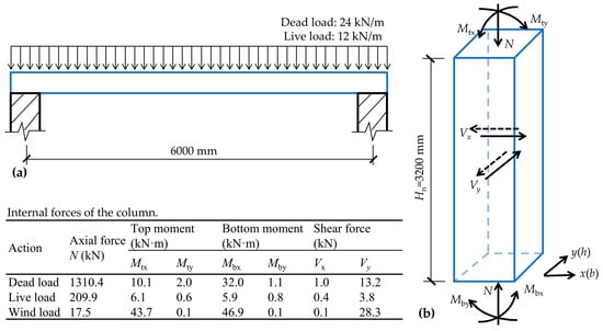 To examine the feasibility and efficiency of the proposed life cycle sustainable design optimization approach, numerical examples of a beam and a column, as shown in Figure 4, were analyzed in this study. They served as typical examples of components in RC structures primarily subjected to bending and axial compression, respectively. The structural deterioration models and the distributions of uncertain parameters followed the descriptions provided in Section 2.5. Material prices were determined based on the market and construction quota, while the carbon emission factors of materials, energy, and transportation were obtained from Zhang and Zhang [].