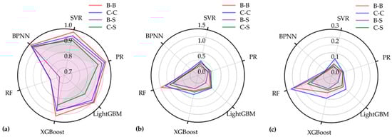 This study used design parameters and load conditions as input features for developing machine learning models. The design parameters included cross-sectional dimensions, strength of materials, diameter and number of main bars, and diameter and spacing of stirrups. The load conditions incorporated live and dead loads for the beams, and axial forces and moments for the columns. Specifically, within defined ranges of discrete design parameters, RC component samples were randomly generated, and the reliability index of each sample during its service life was evaluated using the MCS approach. Subsequently, these samples were used to establish a dataset for developing machine learning models that can predict the reliability indices. Considering that no single algorithm excels in all problems, six alternative algorithms, encompassing polynomial regression (PR), support vector regression (SVR), extreme gradient boosting (XGBoost), Random Forest (RF), light gradient boosting machine (LightGBM), and back propagation neural networks (BPNN), were compared to capture the nonlinear relationship between design variables and reliability indices. Moreover, hyperparameter tuning was performed using Bayesian optimization, which leveraged prior knowledge to efficiently search for optimal settings []. A ten-fold cross-validation technique was applied to reduce the risk of overfitting in training the models, which ensured better generalization by averaging model performance across multiple data subsets. The models were developed using Python’s (v3.11.) scikit-learn library. Based on performance metrics including the coefficient of determination (R2), root mean squared error (RMSE), and mean absolute percentage error (MAPE), the best-performing model was determined as the surrogate model for evaluating reliability indices of structural components. The key steps for developing machine learning models are summarized as follows: