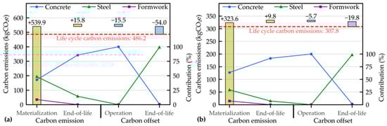 where Qrc and Qrs are the weight of recycled aggregate and steel, respectively; EFrc and EFrs represent the carbon offset potentials of recycled aggregate and steel, respectively, which can be evaluated as the differences between the emission factors of manufacturing primary and recycled materials []. The emission factors of recycled aggregate and steel were taken as 1.5 kg CO2e/t and 0.48 kg CO2e/t [,].