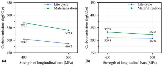 Evaluating life cycle carbon emissions of buildings and structures is a complex process that requires comprehensive analysis from both temporal and spatial perspectives []. Currently, process-based life cycle assessment (LCA) has gained global recognition for quantifying building carbon emissions [,]. This method adopts activity data and corresponding carbon emission factors in the assessment [], which is conceptually simple and effective. Recent research has also combined the process-based LCA with building information modeling and bills of quantities to enhance the calculation efficiency [,]. For RC structural members, their embodied carbon emissions were mainly sourced from the production, construction, carbonization, and end-of-life phases, of which the first two sources were usually considered in previous studies []. For example, Zhang and Zhang [] adopted a “cradle-to-site” system boundary encompassing the material production, transportation, and construction processes to quantify embodied carbon of RC beams. Comparatively, Mergos [] and Park et al. [] considered only the production of primary materials for the assessment of carbon emissions from beams and columns.