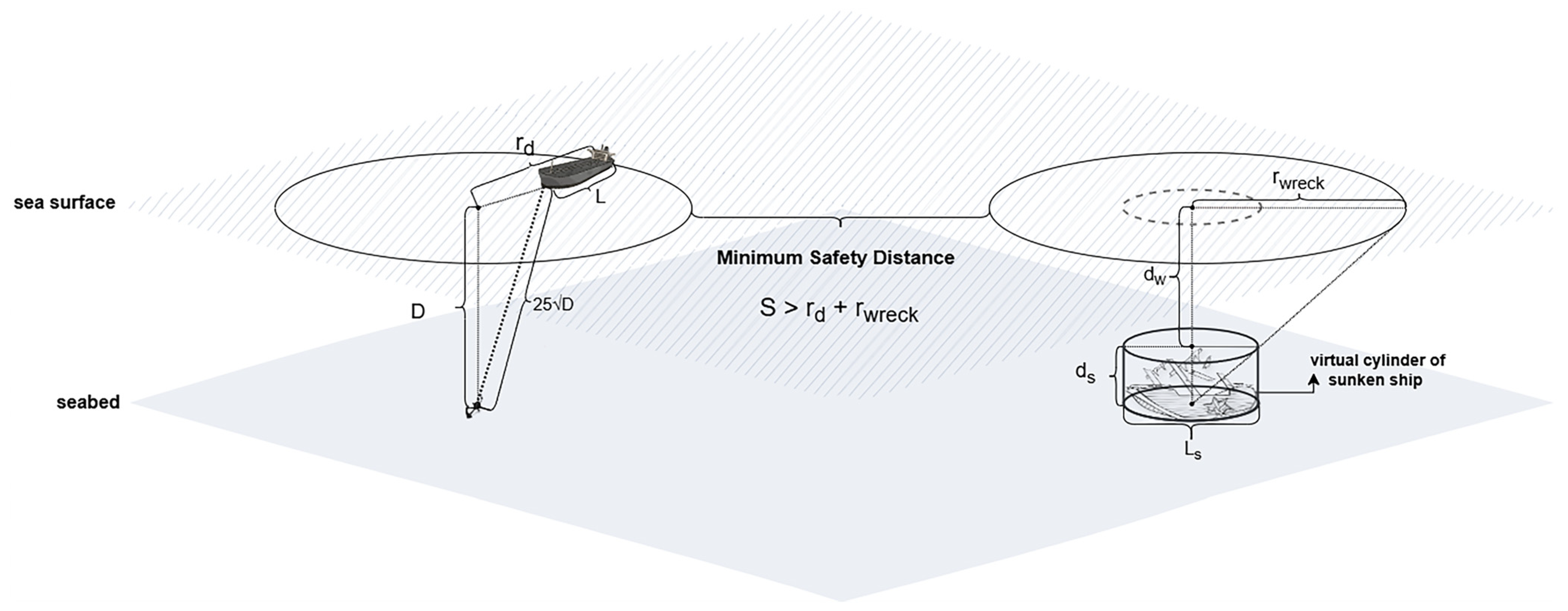 This equation only provides the radius of the minimum safe zone created by the fixed obstacle. However, when determining the safety distance, the circle of a vessel anchoring near this area should also be considered. The movement of this vessel’s chain during anchoring could pose a risk of damage to the anchoring operation or the wreck. Therefore, to determine the practically applicable minimum safe distance “