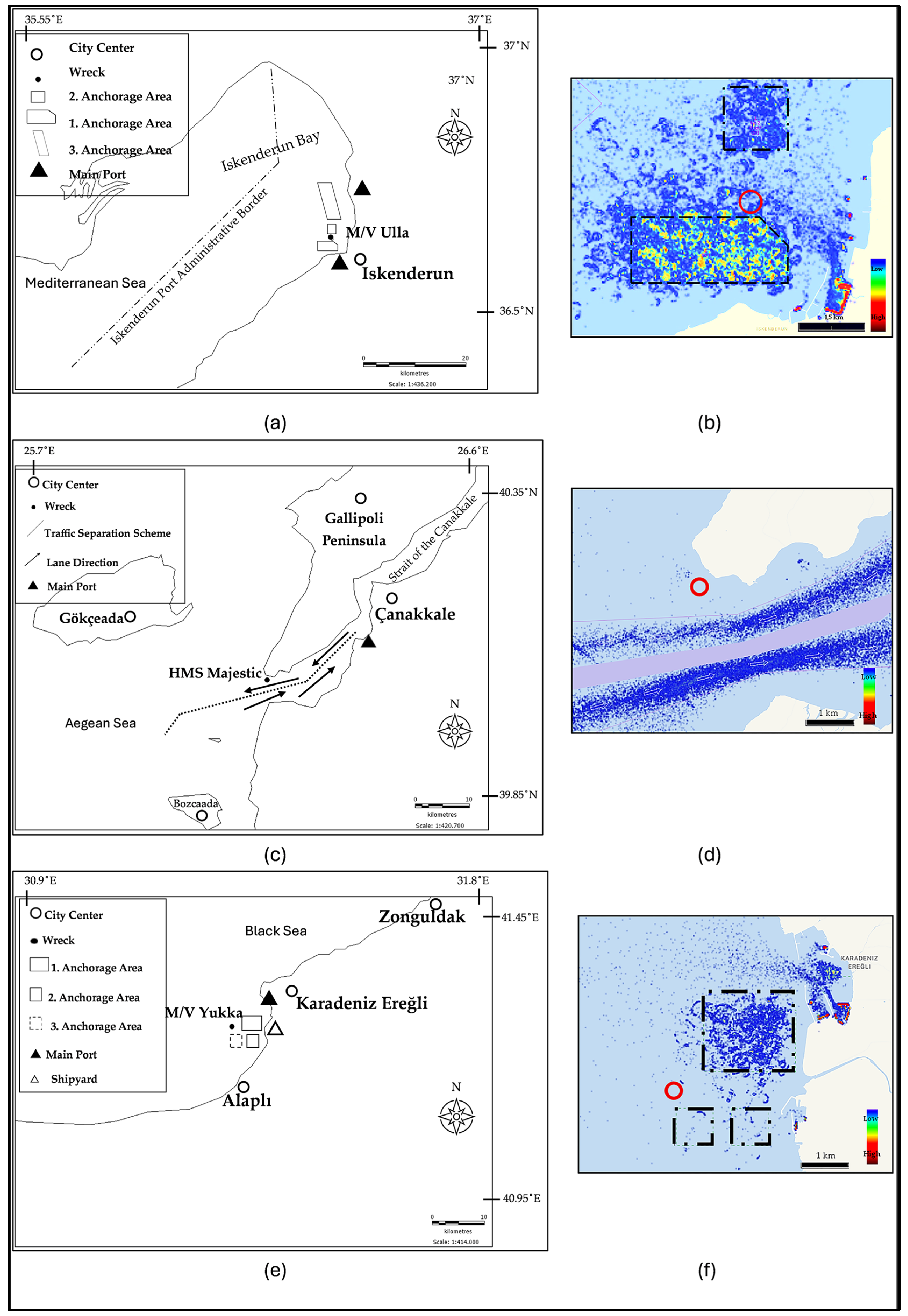 Table 2 and the chemical waste still present inside the sunken ship, distance recommendations have been developed for each risk factor. Although the area around the HMS Majestic wreck is a protected area, the safety distance should be at the maximum Strait conditions due to other historical and dangerous wrecks in the vicinity. Furthermore, the southern part of the Strait entrance is relatively safer for a potential expansion decision. The M/V Yukka wreck site, like the M/V Ulla, is adjacent to the anchorage area (military and commercial), but area usage is not as restrictive as the Bay. However, it poses numerous navigational threats, including adjacent submarines, and is located at the intersection of industrial cargo movement. Additionally, cases resulting in sinking due to hydrometeorological conditions are vital for ensuring navigation safety in this area. While numerous studies on ship drift have been conducted in the literature, it is certain that the ships in the M/V Yukka wreck area could drift by more than 250 m under these conditions, based on the diverse data in [