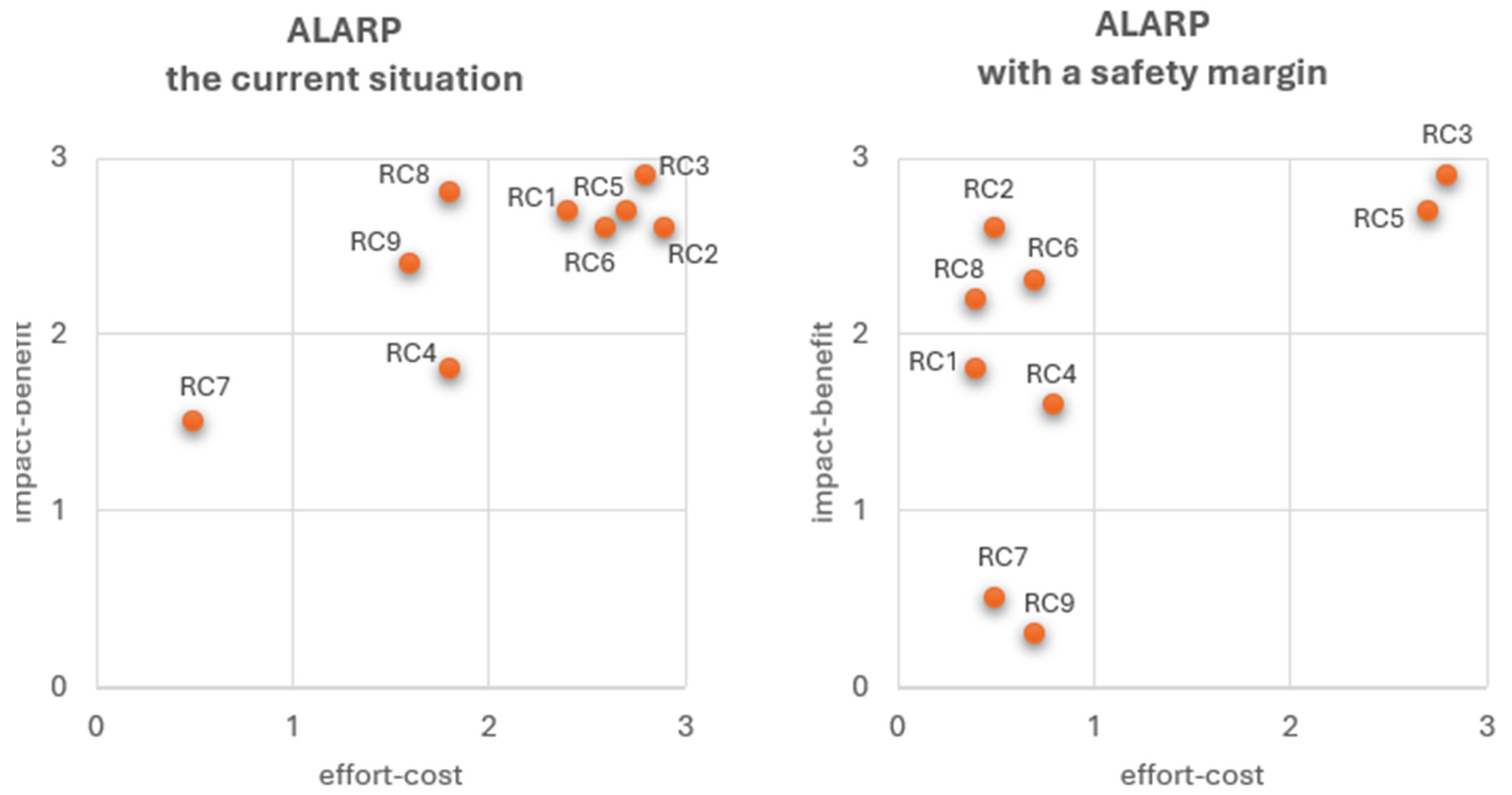 Table 4, and the safety distance response proposed in the study. The three values for each risk factor, with “best,” “medium,” and “worst” scenarios (Low = 1, Medium = 2, High = 3), are shown on the X-axis as the effort-cost, and on the Y-axis, it is shown as a point based on the impact-benefit score as the effect of risk reduction. Accordingly, the ALARP area in the second graph provides the most ideal intervention zone for risks such as RC2, RC6, RC8, and RC1, which involve high reduction effects and low/moderate costs.