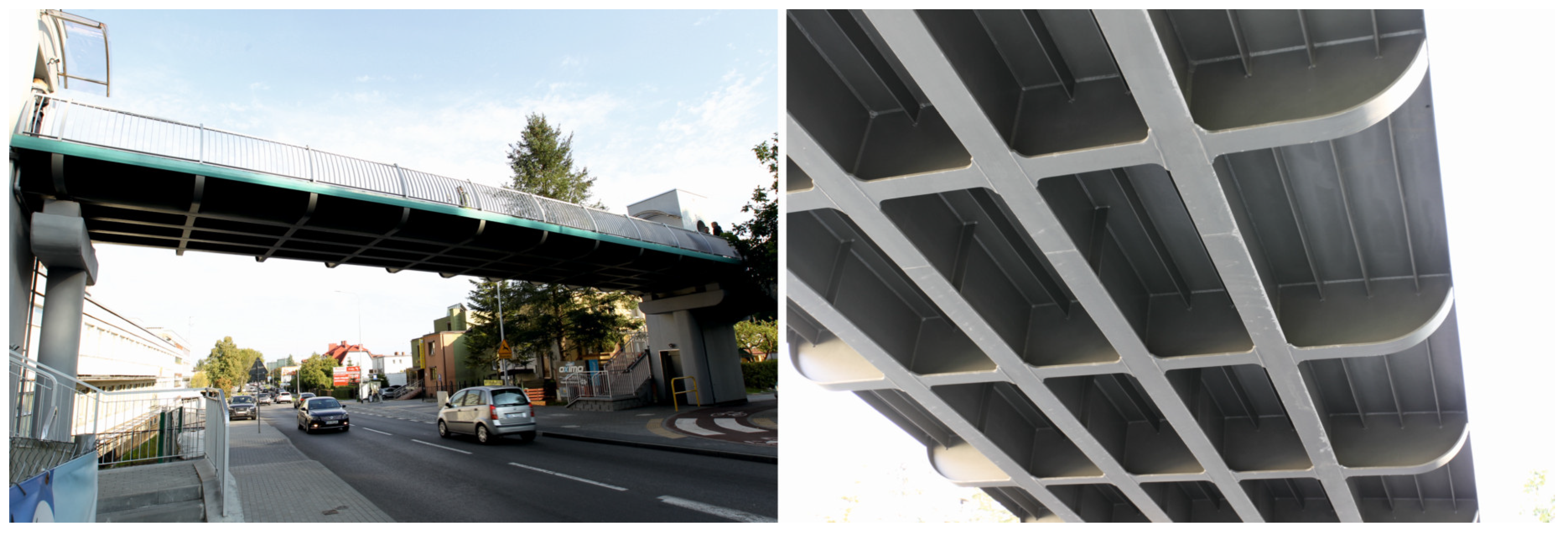 - Salamak, M.; Łaziński, P. Experimental Identification of the Dynamic Properties of Three Different Footbridge Structures. In Proceedings of the Third International Conference Footbridge, Porto, Portugal, 2–4 July 2008; pp. 319–320. [Google Scholar]
