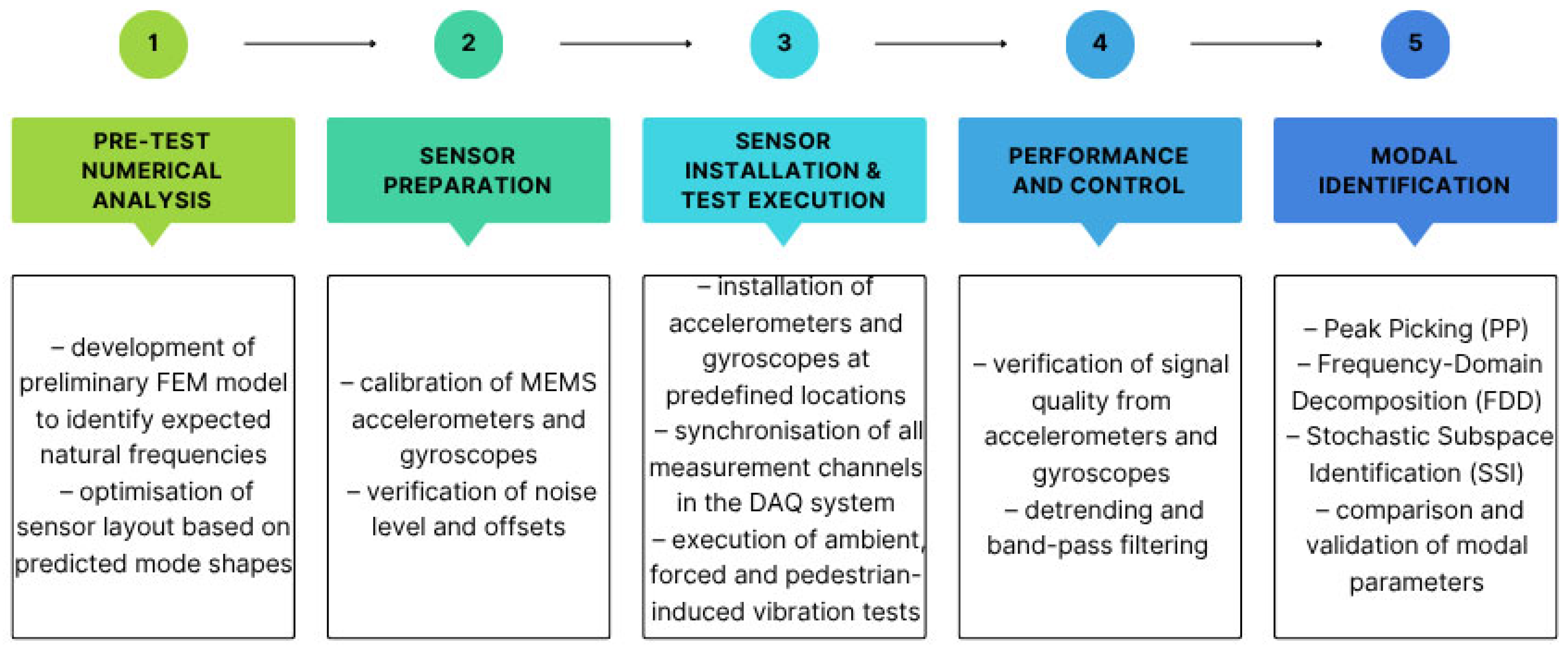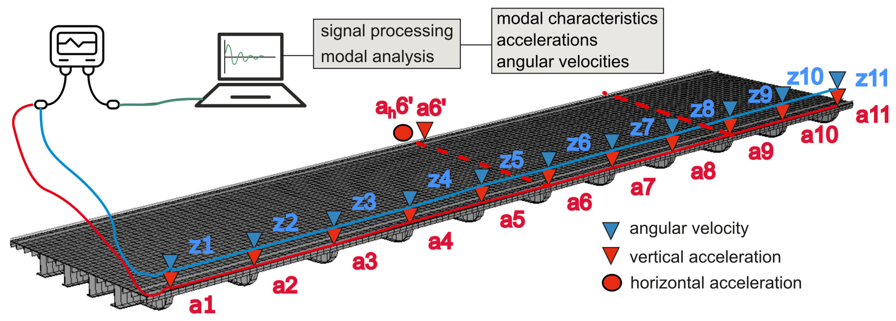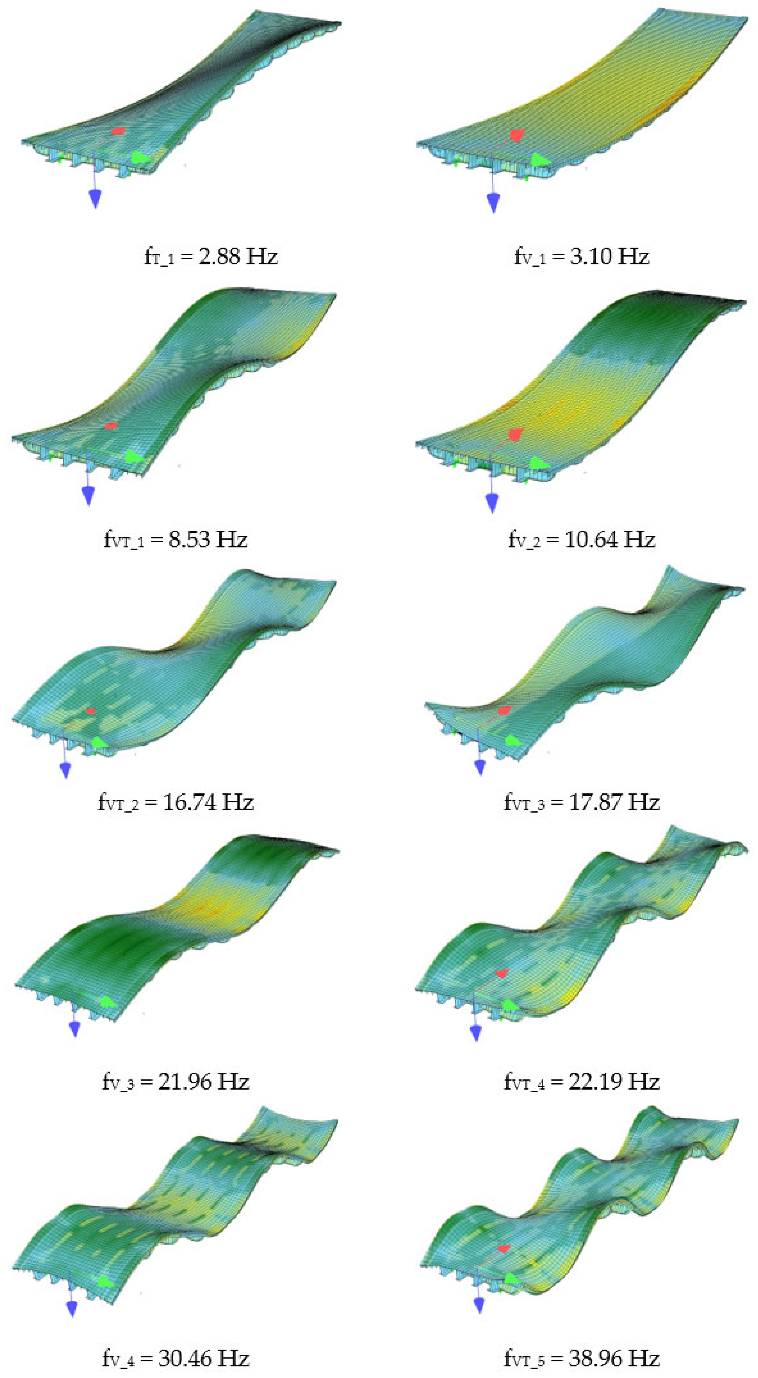 - Combining rotational velocities with acceleration measurements improved modal identification, particularly for coupled vertical–torsional modes. Rotational responses enabled clear recognition of mode VT2, which remained partly obscured when using accelerations alone.