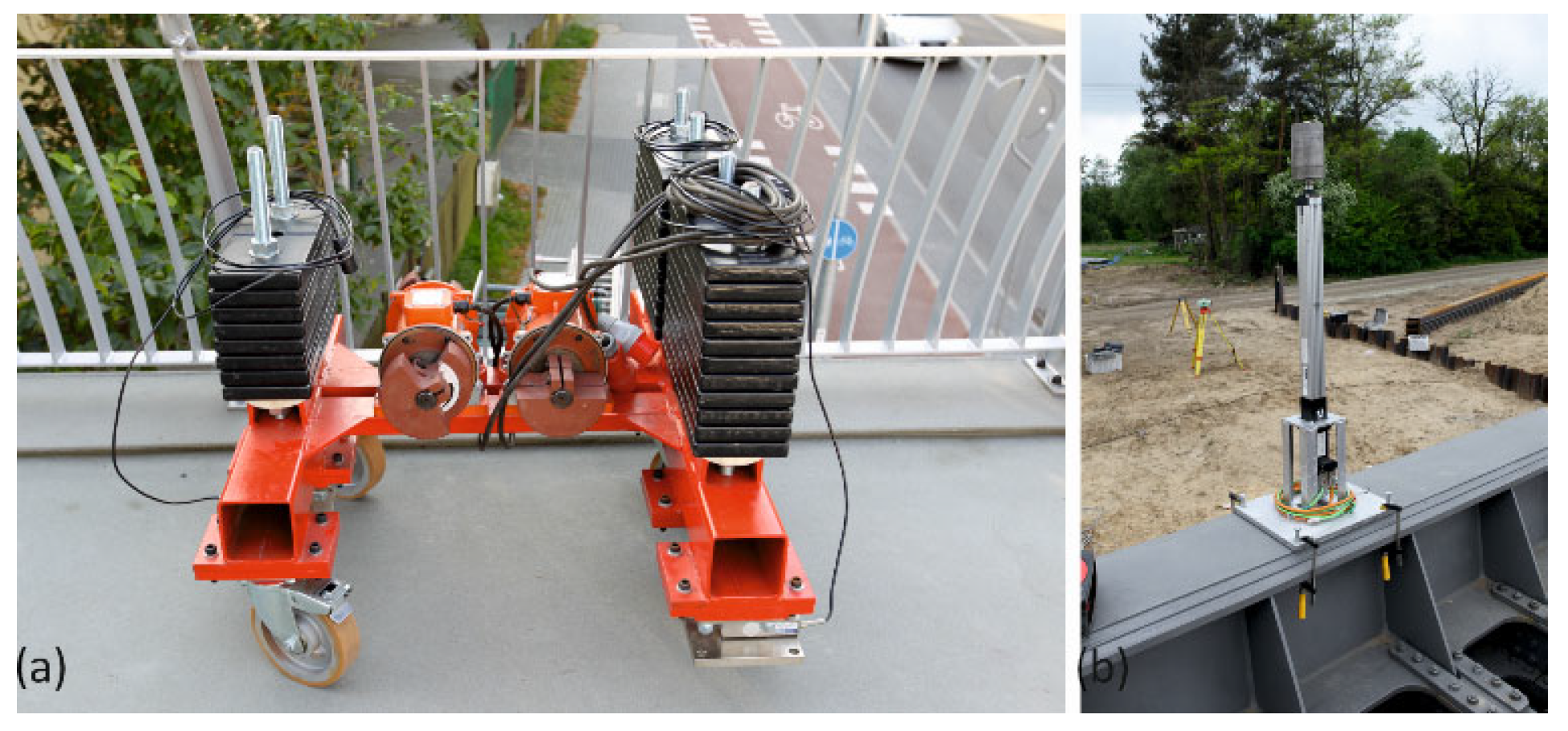 - Drygala, I.; Dulińska, J.; Jasińska, D.; Tatara, T.; Małecki, M.; Grabon, S.; Mesar, R. Dynamic Performance Analysis of a Single-Span Footbridge Supported by a Spatially Variable. In Proceedings of the Experimental Vibration Analysis for Civil Engineering Structures, Porto, Portugal, 2–4 July 2025; Volume 2, pp. 436–445. [Google Scholar]
