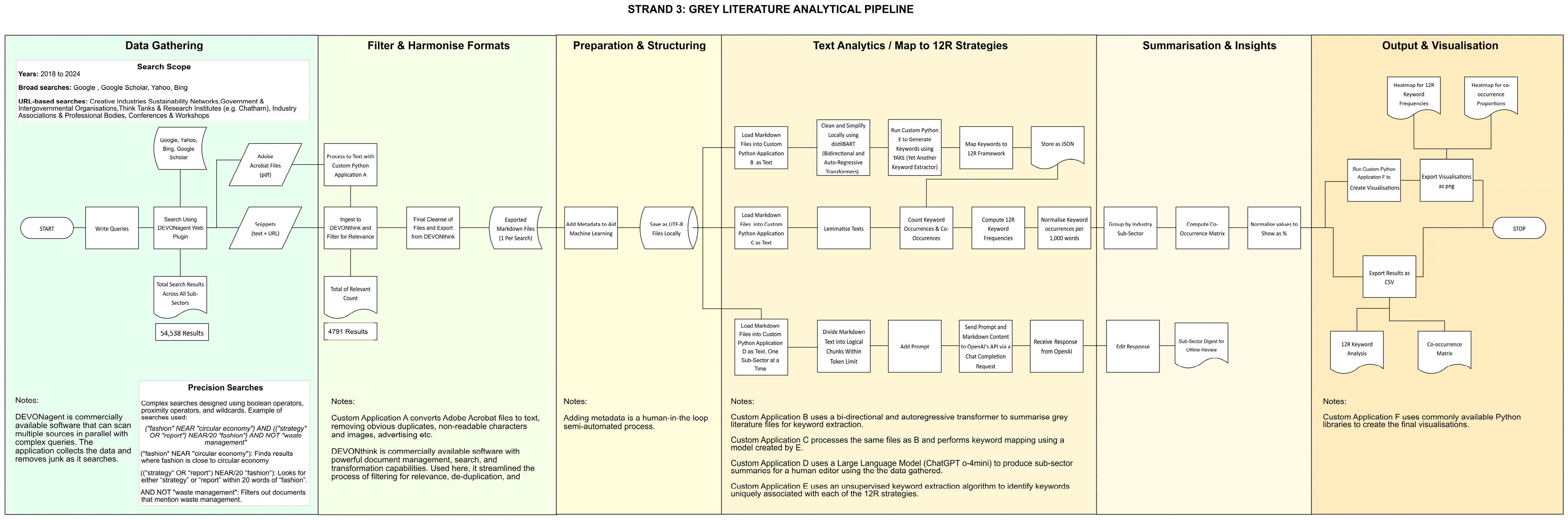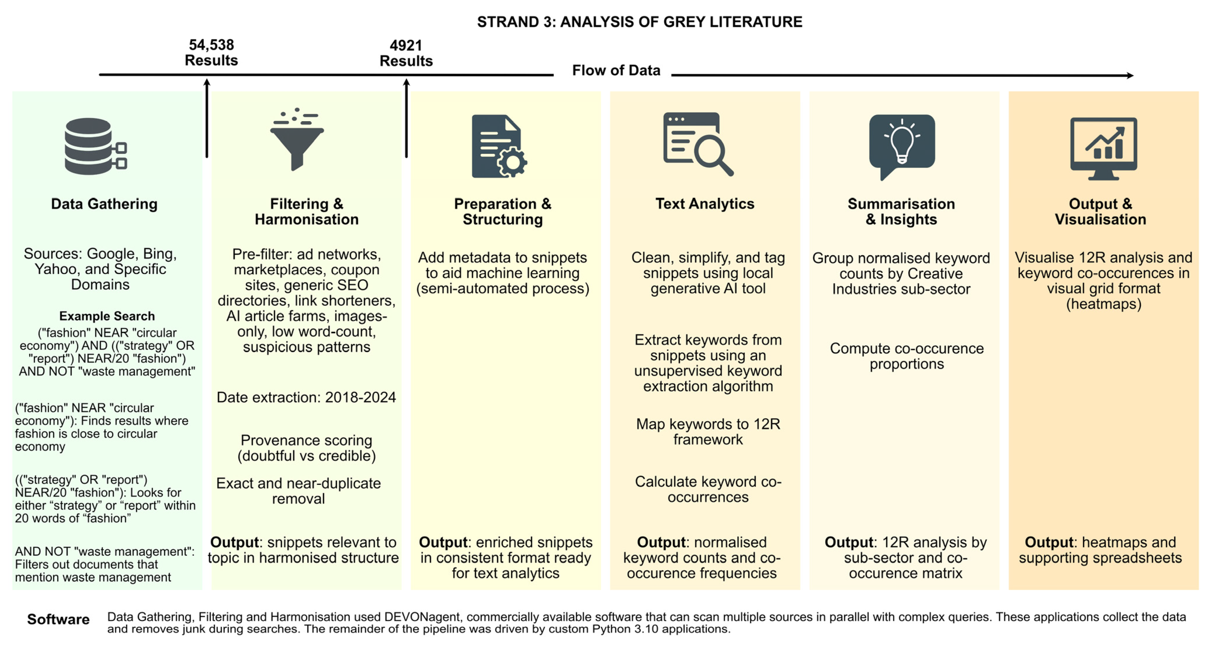 Grey literature searches for the CE in the creative industries yielded 54,538 initial results, a high proportion of which were duplicates or short entries with links pointing to the same source. After deduplication, removal of short and off-topic entries, adverts, pay-walled articles, and academic journal entries, this gave 4791 unique items (known as ‘snippets’) that had been screened for relevance to the CE across the sub-sectors of the creative industries. These snippets were used for text analytics.