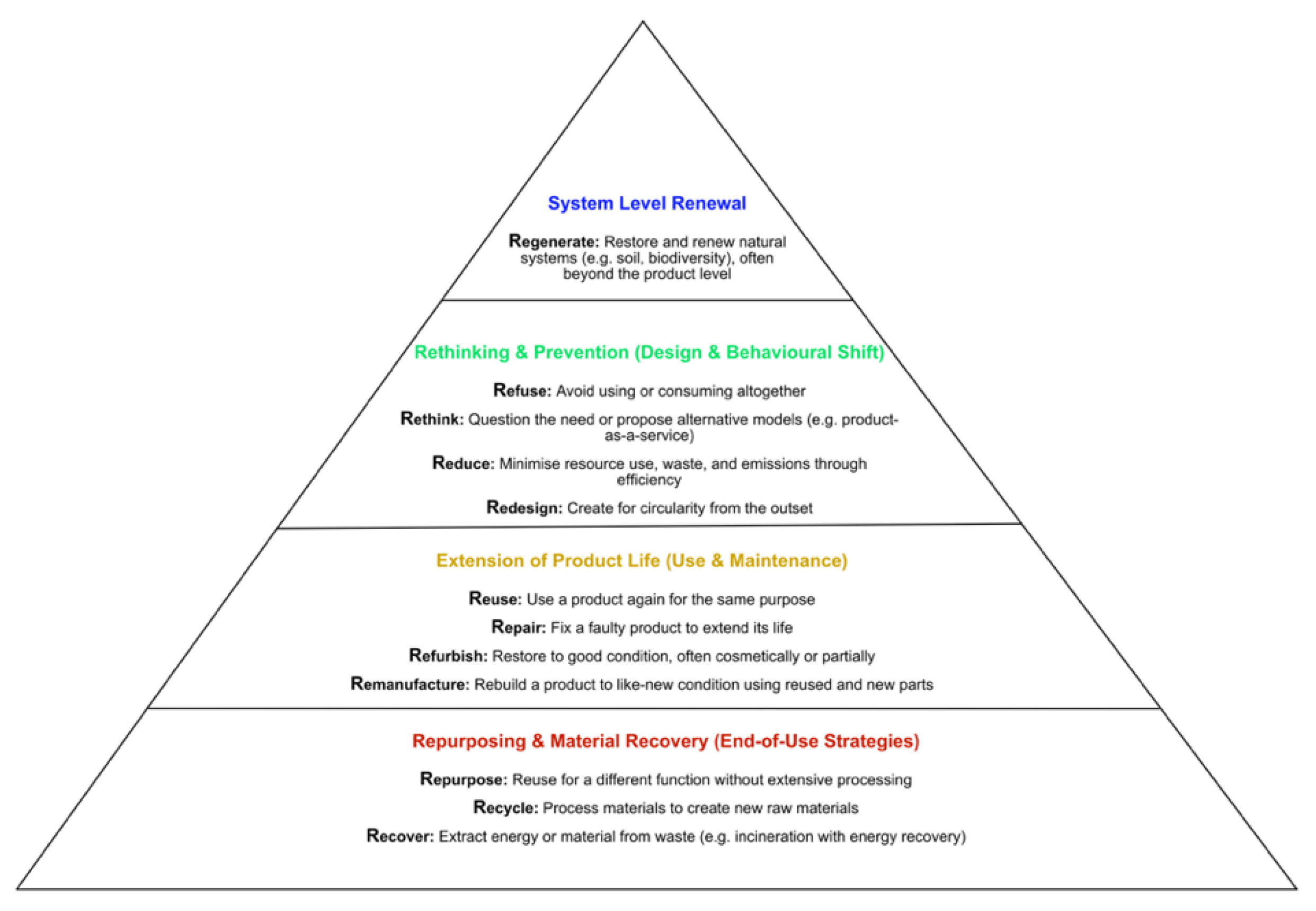 This analysis shows that different sub-sectors (or segments within the sub-sector) are oriented towards different combinations of R strategies, and that three of the 12Rs are little mentioned (remanufacture, refurbish, and refuse). However, it is also possible that there are different understandings of the 12Rs between sub-sectors.