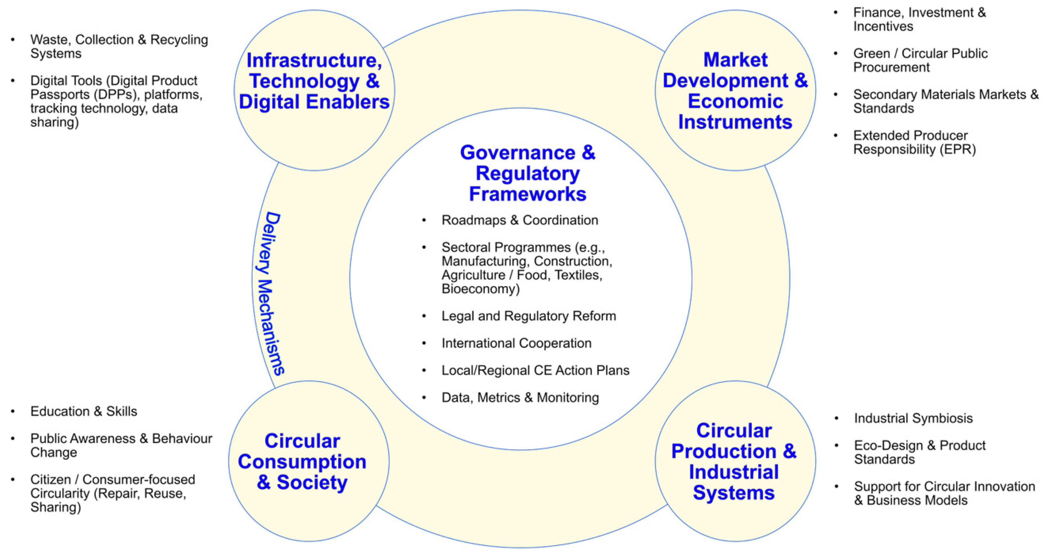 The national CE strategies analysed use the language of sustainable development and public good, yet most anticipate transition via predominantly market-driven mechanisms, including green finance and bonds to stimulate CE investment; the mobilisation of private capital through venture and equity markets; price-based incentives to favour secondary resources; public procurement clauses to create demand for circular products; and investment in waste and digital infrastructures. The strategies also promote innovation in areas such as AI-enabled recycling, blockchain traceability, and circular design tools, typically under light-touch regulatory regimes.