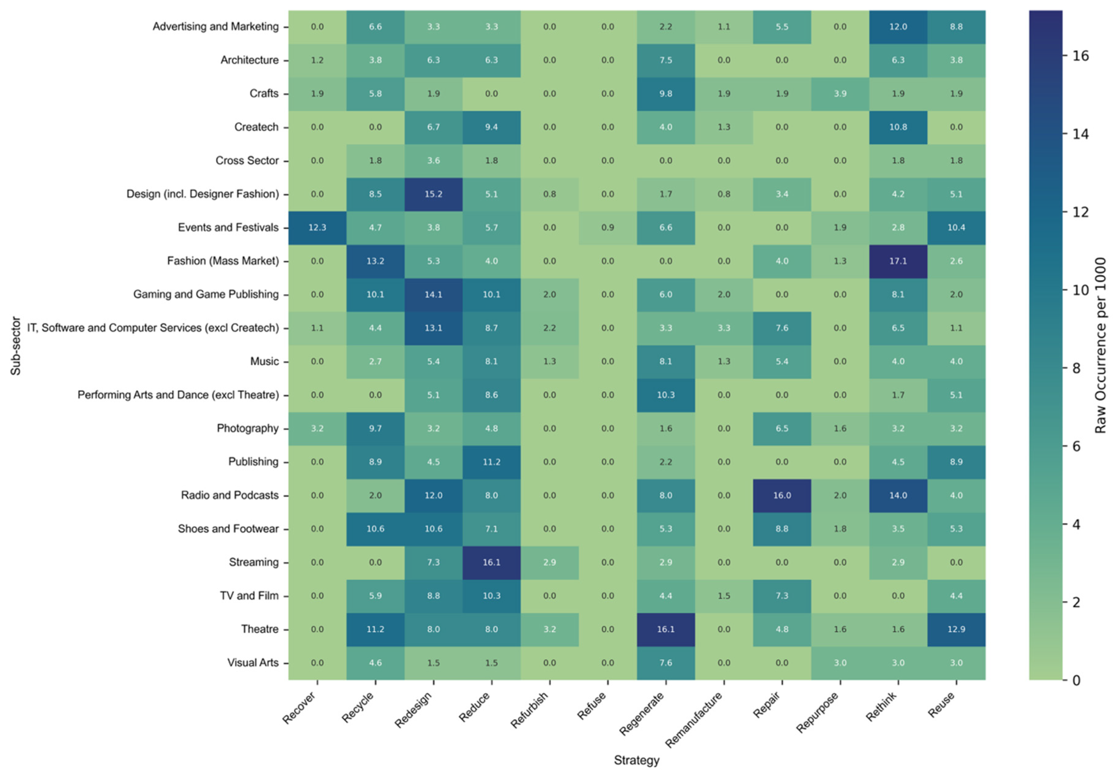 To further examine the practical application of the 12R strategies to the creative industries, additional text analytics were applied to the dataset to identify how the 12R strategies map out across the different sub-sectors. In some cases, sub-sectors have been further divided where this yielded meaningful findings, e.g., separating mass market fashion from designer fashion, radio and podcasts from TV and film, and theatre from the rest of the performing arts. The results are presented in