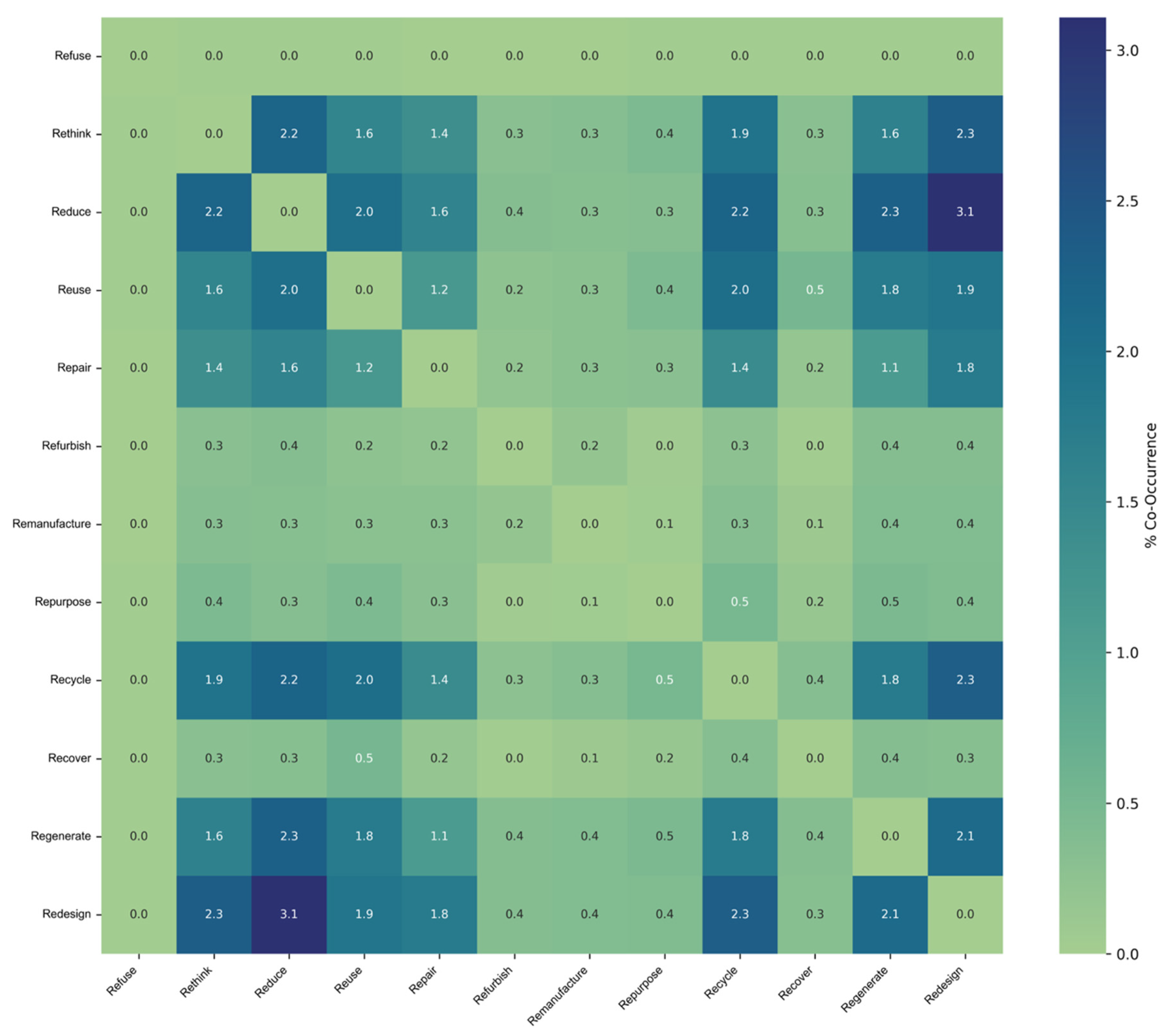 Figure 7 presents the co-occurrences of the 12Rs in the dataset (a value of greater than 1.6% represents a significant co-occurrence at the 95% confidence level derived from a binomial one-sided test under the assumption of independence between terms). These pairings suggest natural groupings in how people write and think about CE topics. Redesign appears in three of the top five high-frequency co-occurrences. Redesign pairs particularly strongly with reduce, rethink, and recycle, reflecting its core role as a bridge between R strategies (e.g., the more technical strategies such as recycle, and strategic ones such as rethink). Reduce is also prominent (appears in three high-frequency pairs), implying that it is used in multi-dimensional contexts, i.e., not just about cutting resource use, but also reframing and reimagining designs, and systems.